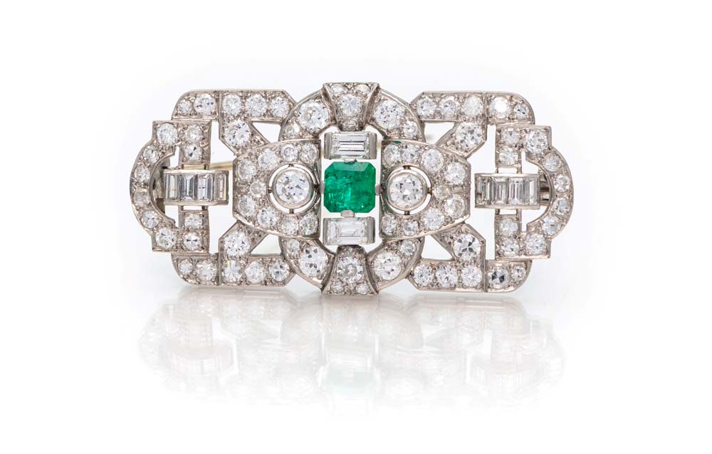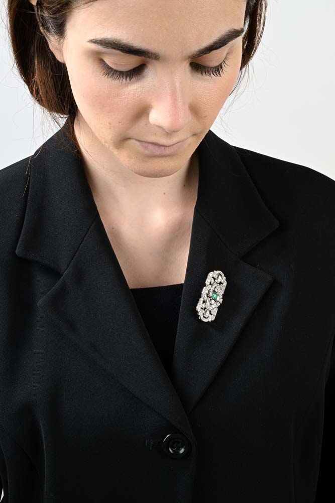 Spilla a placca in oro, smeraldo e brillanti cm 5 x 2 Oro bianco 750/000. Diamanti in taglio rotondo brillante e baguettes ct. 2,30 ca, smeraldo in taglio smeraldo ct. 0,80 ca. Peso complessivo gr. 12,60