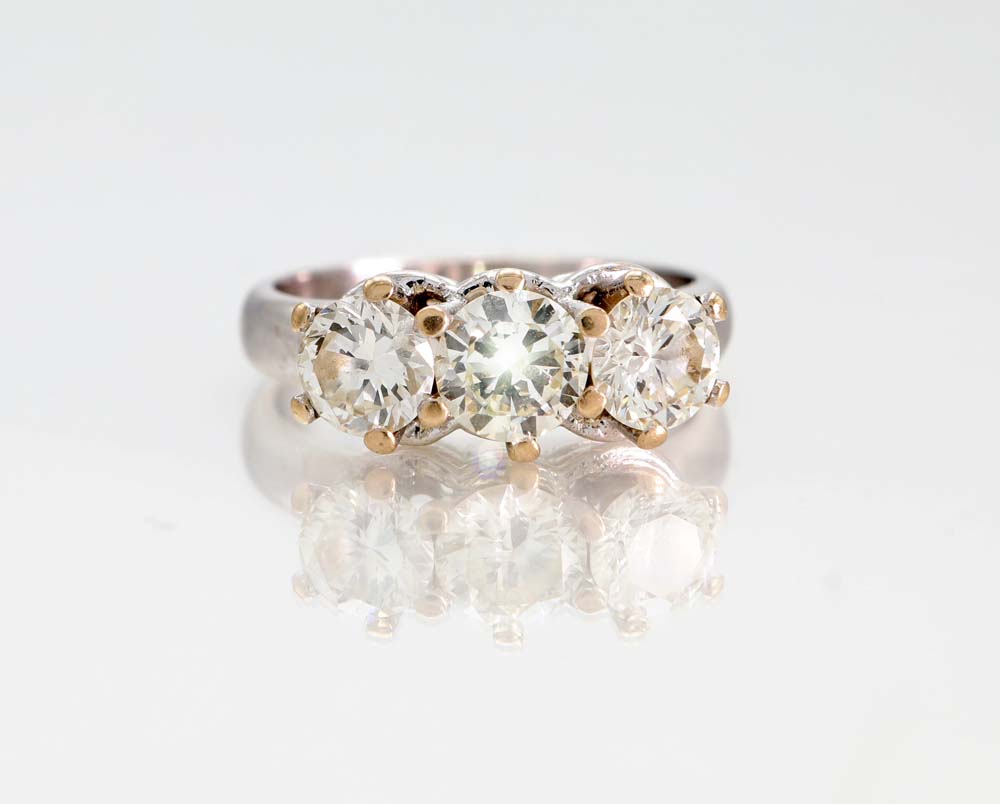 Anello trilogy in oro e brillanti Misura 11 Oro bianco 750/000. Diamanti in taglio rotondo brillante ct. 1,90, inf. K, VS. Peso complessivo gr. 5,60. Corredato di certificazione gemmologica