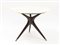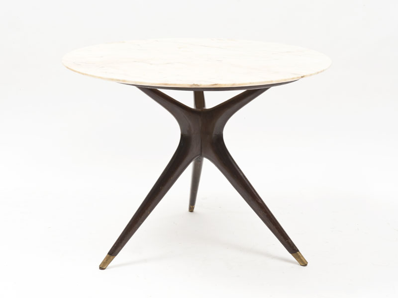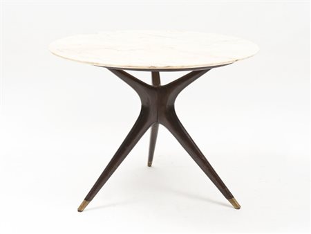 Tavolo tondo con piano in marmo bianco venato, tre gambe in legno rastremate e convergenti, puntali in lamina di ottone. Esecuzione italiana anni 50 del sec XX (d cm 100x75 h).