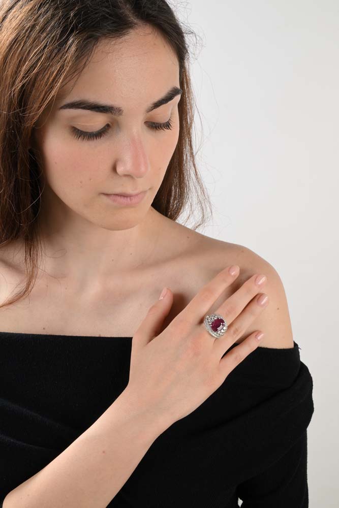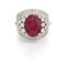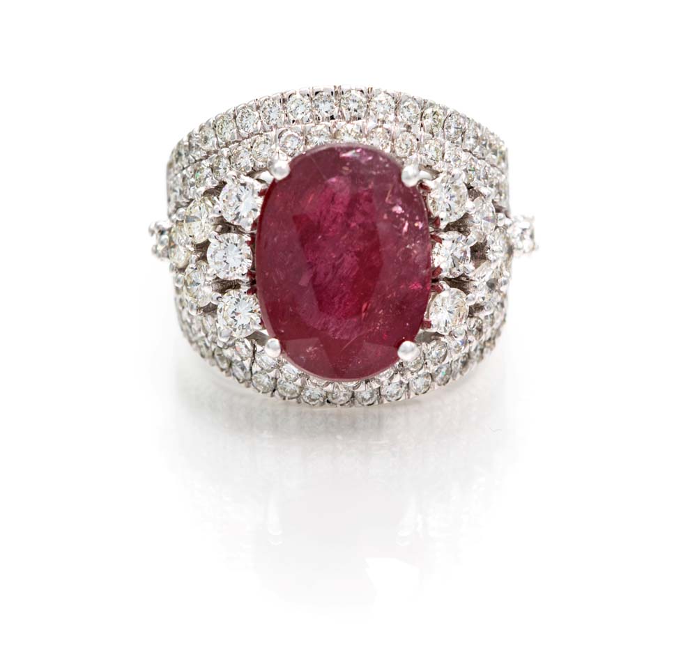 Anello a fascia in oro, brillanti e grande rubino Misura 14 Oro bianco 750/000. Diamanti in taglio rotondo brillante ct. 2,20 ca. Rubino in taglio ovale ct. 7 ca. Peso complessivo gr. 13,80.