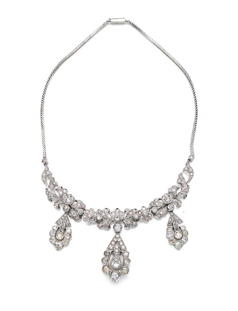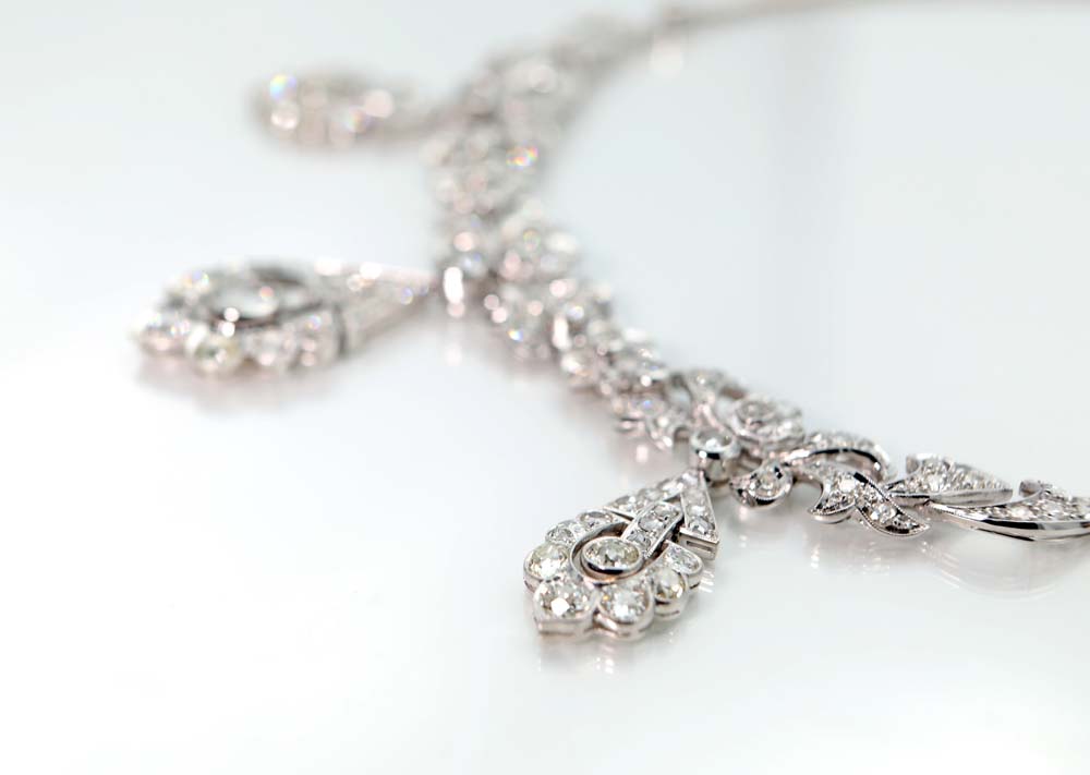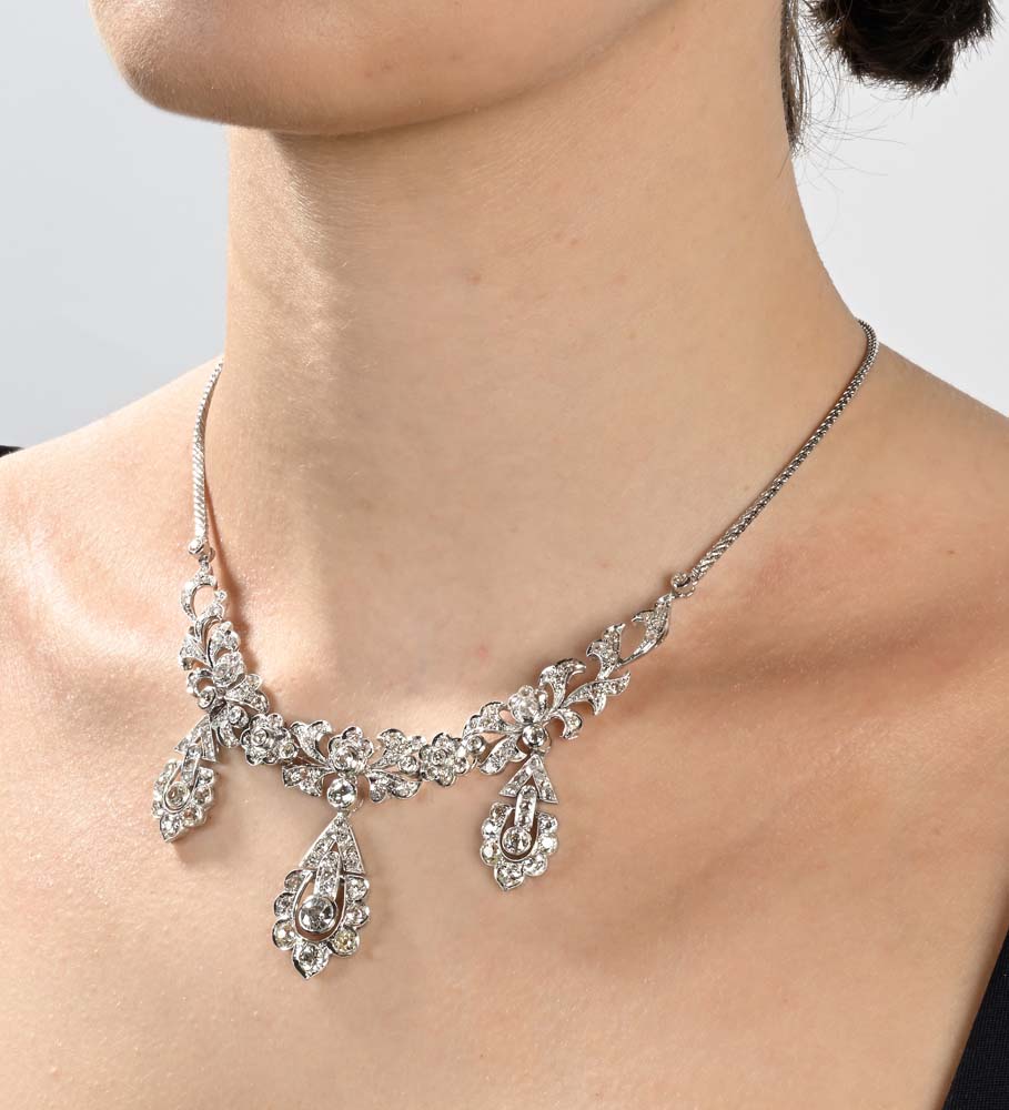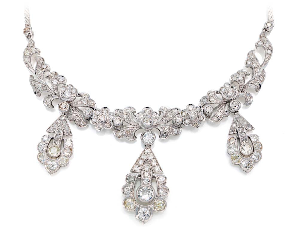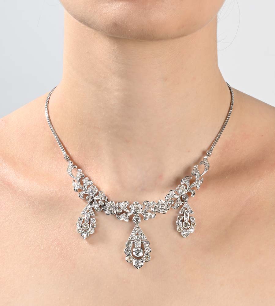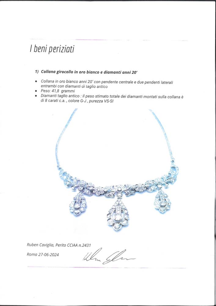 Pettorale in oro e brillanti Lunghezza cm 41 Oro bianco 750/000. Diamanti in taglio antico ct. 8, colore G-J, purezza VS-SI. Peso complessivo 41,80.