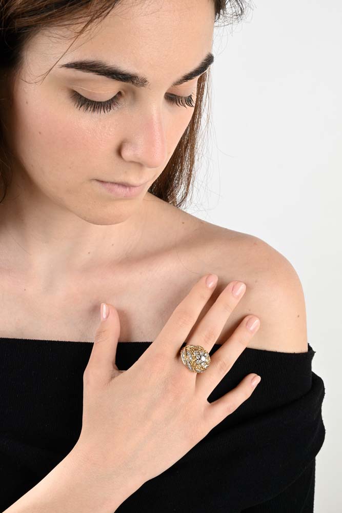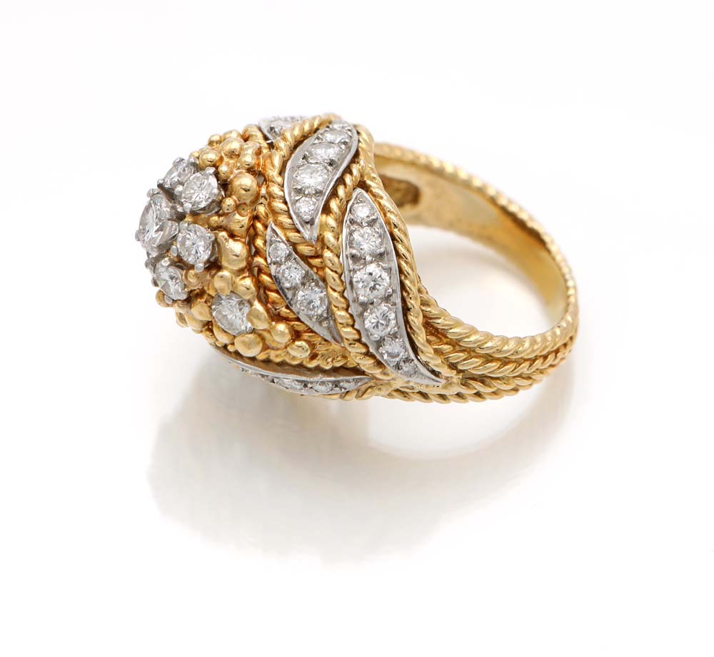 Anello a cupola in oro e brillanti Misura 13 Anni '50 Oro giallo 750/000. Diamanti in taglio rotondo brillante ct. 1,20 ca. Peso complessivo gr. 17,20