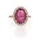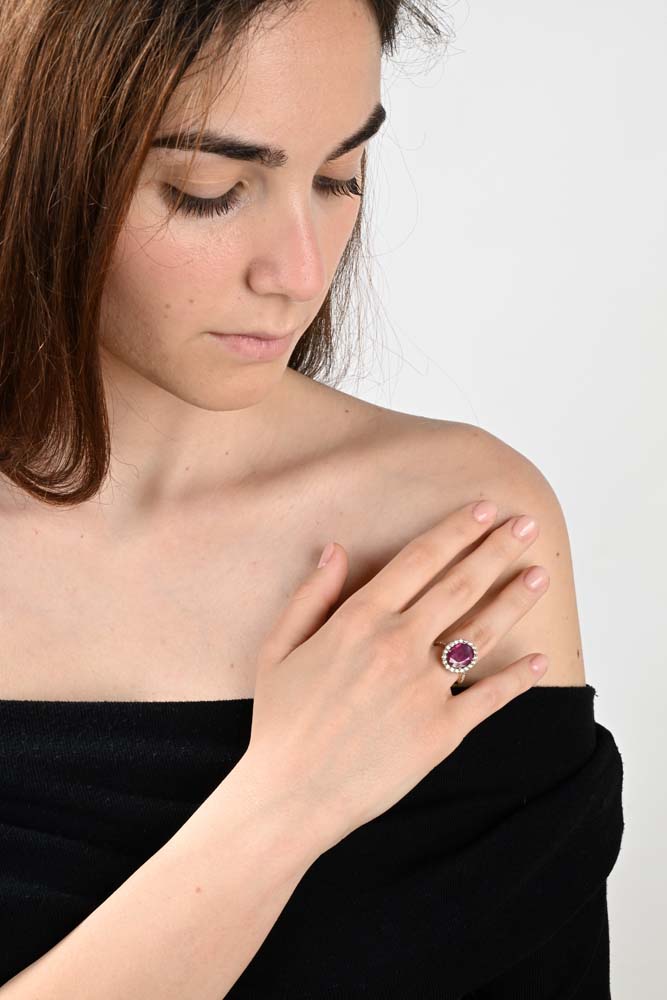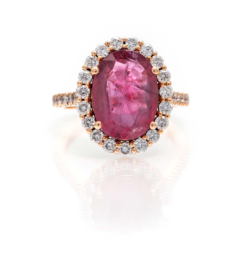 Anello in oro rosa, brillanti e rubino Misura 13 Oro rosa 750/000. Rubino in taglio ovale ct. 4,5 ca. Diamanti in taglio rotondo brillante ct. 0,70