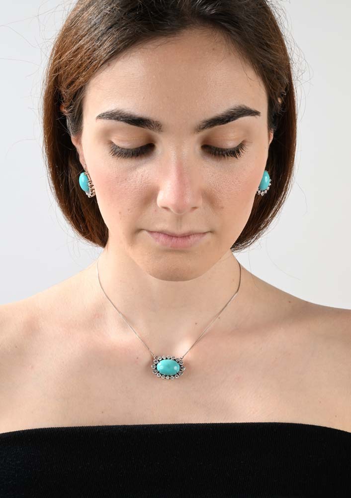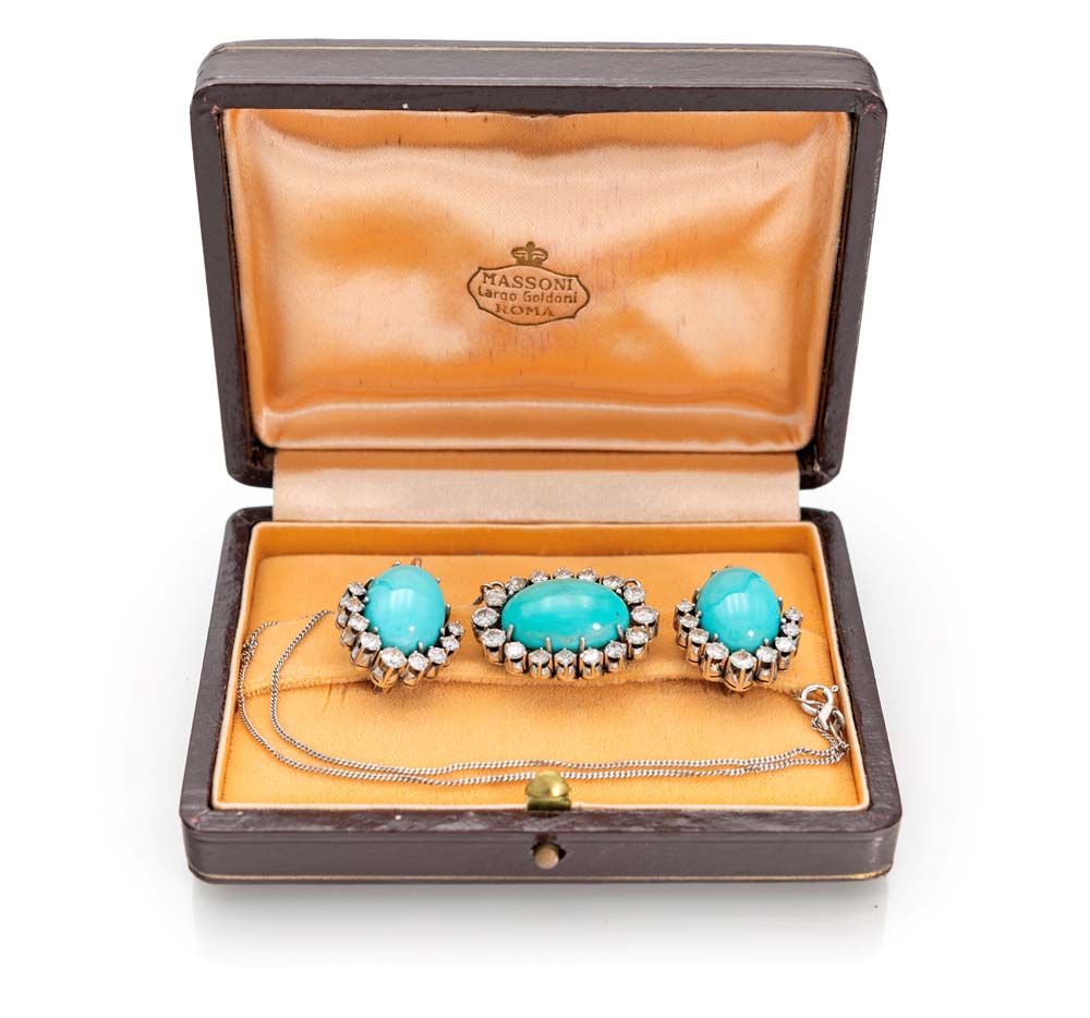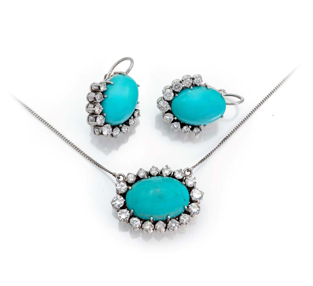 Parure girocollo e orecchini in oro, turchese e brillanti Girocollo lunghezza cm 40, centrale cm. 2 x 3. Orecchini cm. 3 x 2 Oro bianco 750/000. Diamanti in taglio rotondo brillante ct. 1,50. Peso complessivo gr. 20,30. Corredati di custodia Massoni, Roma.