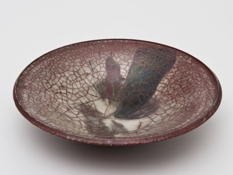 Carlo Zauli (1926 - 2002) - Ciotola in ceramica smaltata nei toni del rosso e del grigio-azzurro, superficie craquelé a leggero lustro metallico. Marezzatture sulla superficie dell’incavo nei toni dell’avorio, del grigio e del viola. Anni 80 del sec XX (h cm 8, d cm 32) (difetti)