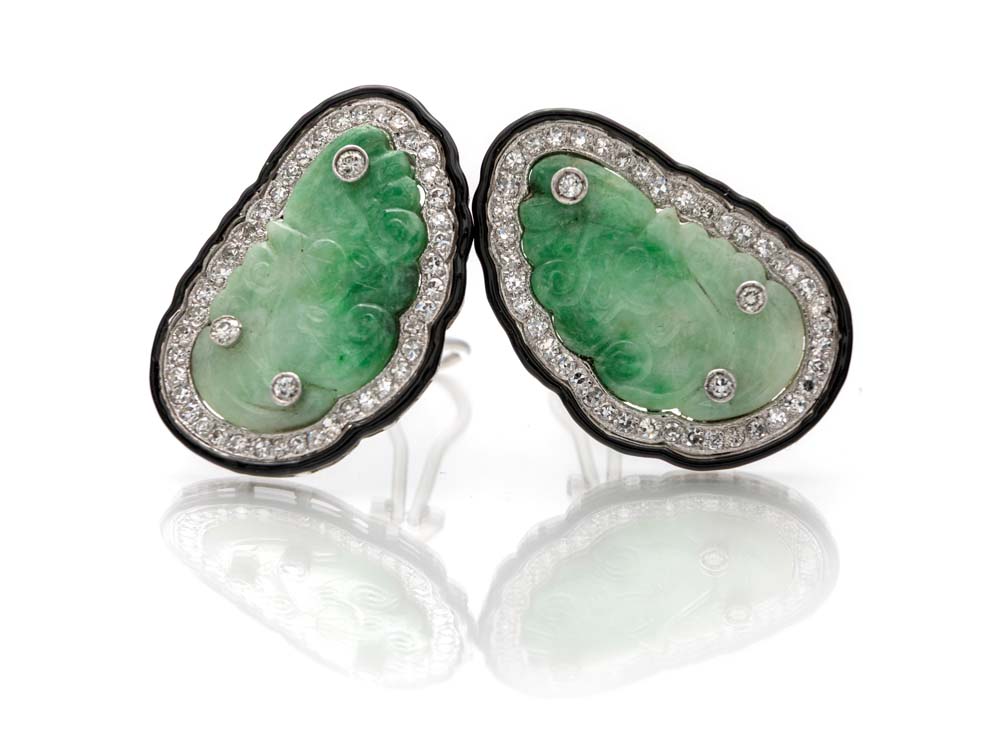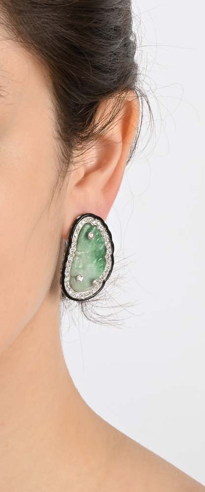 Coppia di orecchini in oro, giade, smalto e brillanti cm 4 x 2,50 Oro bianco 750/000. Peso complessivo gr. 25,20