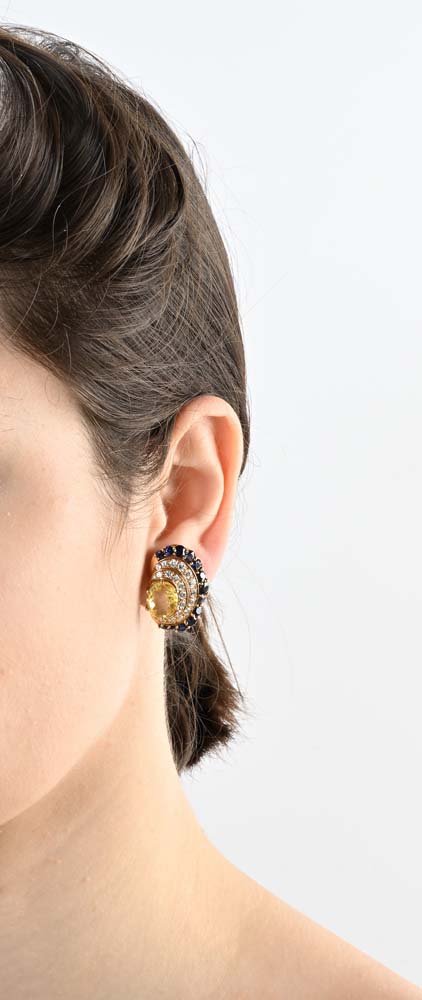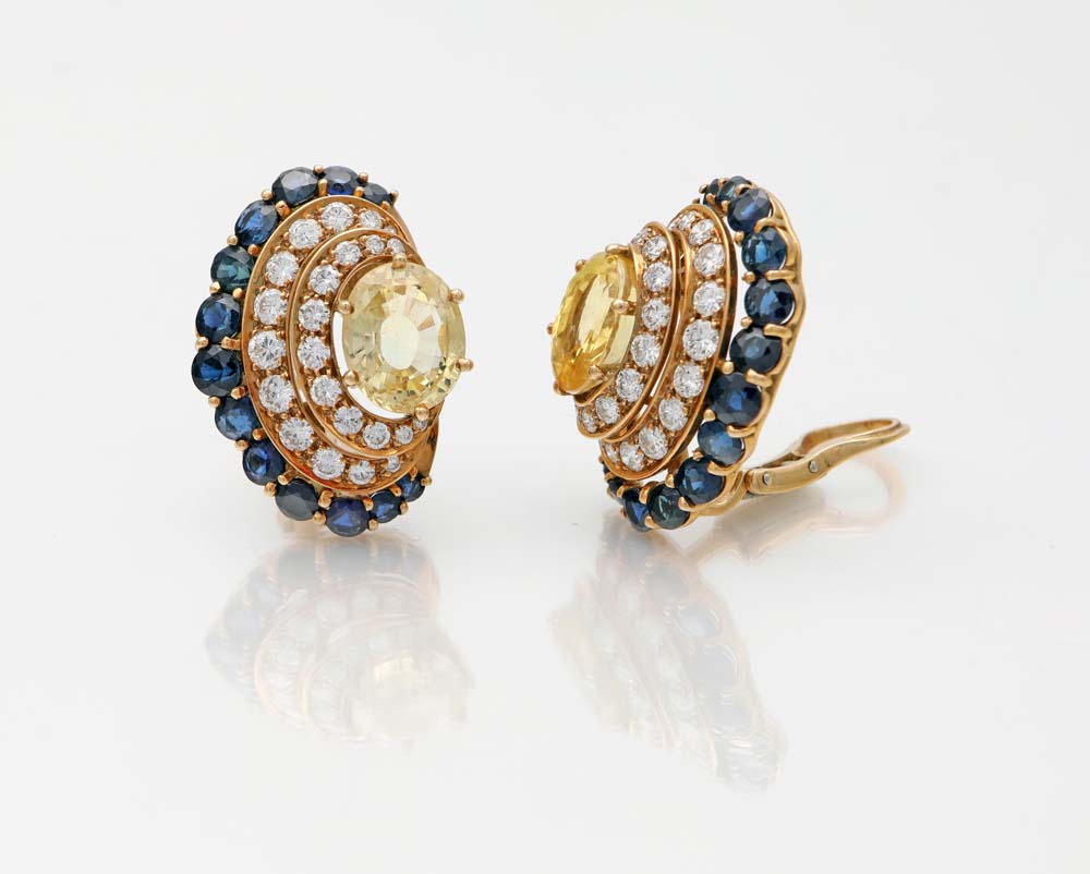Coppia di orecchini in oro, zaffiri e brillanti Oro giallo 750/000. Diamanti in taglio rotondo brillante ct. 1,20 ca. Peso complessivo gr. 17,70.