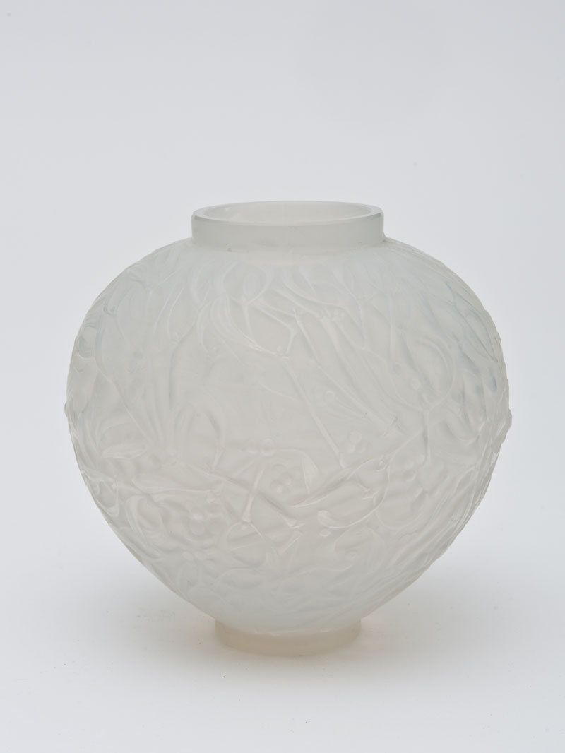 Lalique, Francia - Vaso mod. “Gui”, in vetro opalescente soffiato in stampo, molato sull’orlo superiore del collo e alla base. Corpo decorato con motivi a rilievo raffiguranti racemi di vischio. In origine disegnato nel 1920, n. di catalogo 1435, prodotto dal 1928 al 1932, soppresso dal catalogo nel 1937 e non ripreso dopo il 1947. Esemplare firmato e numerato a punta sotto la base “R. Lalique France n°. 948. (h cm 17) (difetti) Bibliografia: F. Marcilhac, R. Lalique. Catalogue raisonné de l’oeuvre de verre, Les éditions de l’Amateur, Paris 2004, p.427.