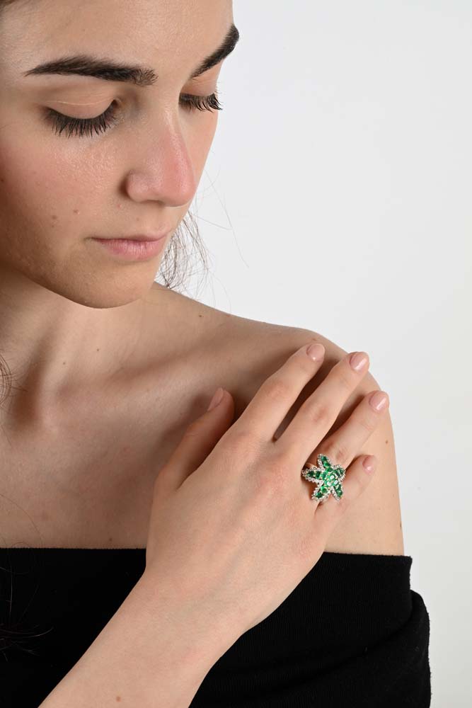 Anello a stella in oro, brillanti e smeraldi Misura 15 Oro bianco 750/000. Smeraldi in taglio rotondo ct. 6, diamanti in taglio rotondo brillante ct. 1,50. Peso complessivo gr. 14,70.