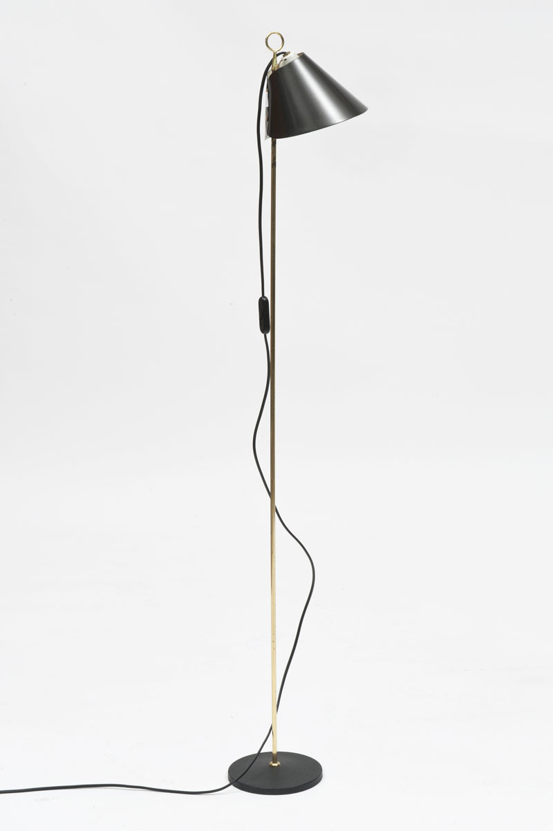 Luigi Caccia Dominioni (1913) - Lampada da terra modello "LTE4 Monachella", base in ghisa verniciata in nero, asta in ottone lucidato e paralume scorrevole in alluminio laccato nero. Produzione Azucena, Milano, disegno 1953, esemplare prodotto negli anni 70/80. (alt. cm 120) Bibliografia: G. Gramigna, Le fabbriche del design. I produttori dell'arredamento domestico in Italia. Allemandi, Torino 2007, p. 43
