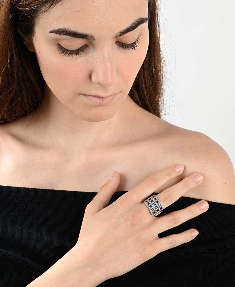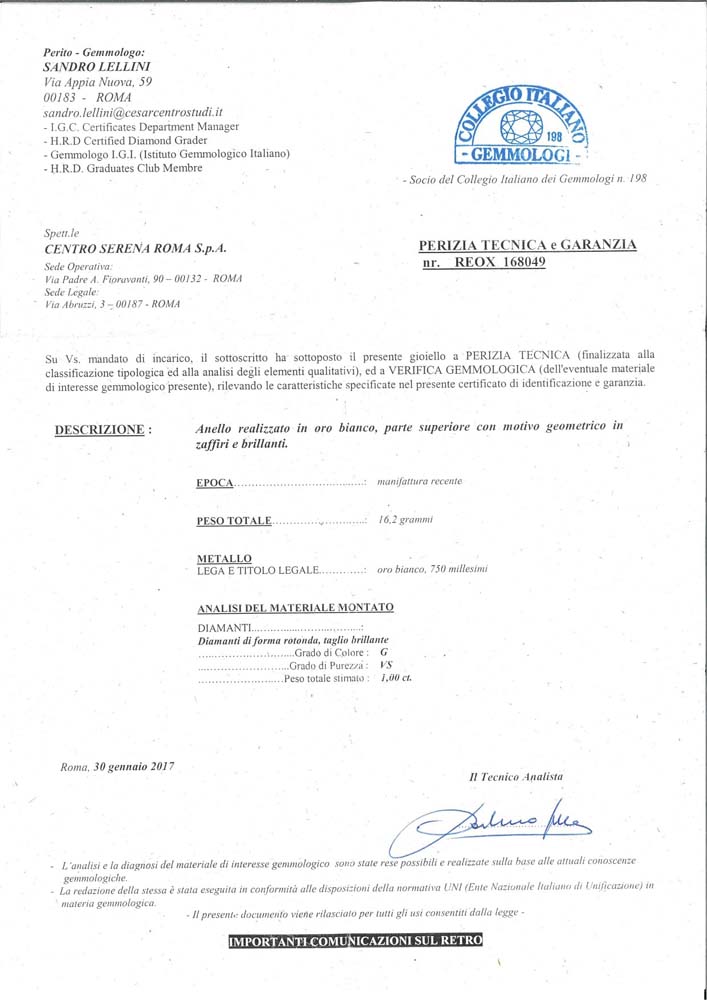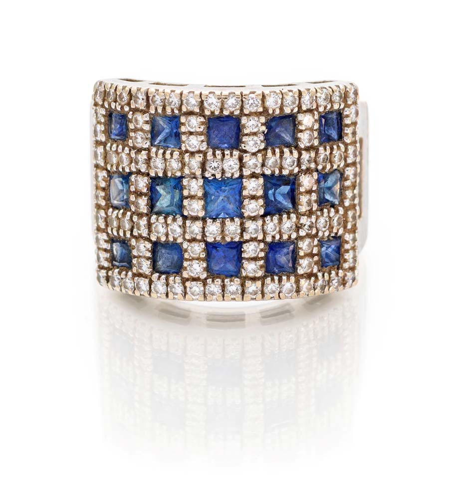Anello a fascia in oro e zaffiri Misura 12 Oro bianco 750/000. Diamanti in taglio rotondo brillante ct. 1, G, VS. Zaffiri in taglio carrè. Peso complessivo gr. 16,20. Corredato di certificazione gemmologica.