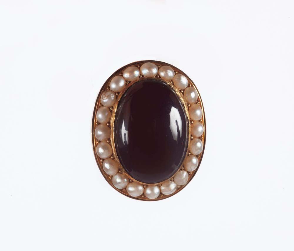 Spilla in oro con perline e pietra centrale Cm 3 x 2,2 Oro giallo 750/000. Peso complessivo gr. 12,50