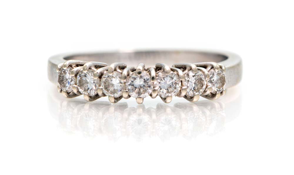 Anello a riviera in oro e brillanti Misura 16 Oro bianco 750/1000. Diamanti in taglio rotondo ct. 0,50 ca. Peso complessivo gr. 4,50