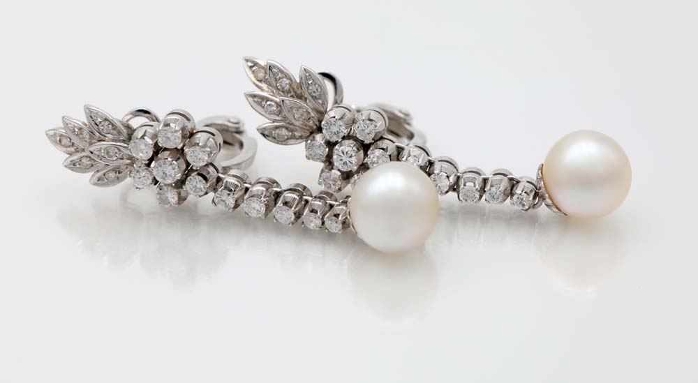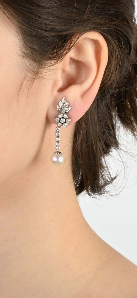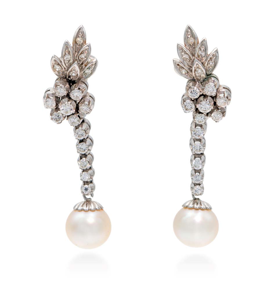 Coppia di orecchini in oro, brillanti e perle Lunghezza cm 4,5 Oro bianco 750/000. Diamanti in taglio rotondo brillante, perle da coltivazione mm. 9.
