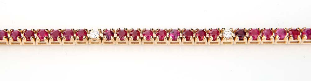 Bracciale tennis in oro, rubini e brillanti Lunghezza cm 18 Oro rosa 750/000. Rubini naturali in taglio rotondo ct 4 ca., diamanti in taglio rotondo brillante ct, 0,20 ca.Peso complessivo gr. 10