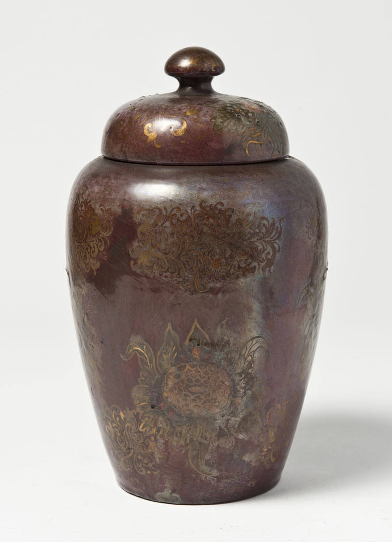 Pietro Melandri (Faenza 1885 - 1976) - Vaso ad urna con coperchio in ceramica a lustri policromi decorato con disegni vegetali, anni 30 del sec XX. Firmato e marcato in oro sotto la base "Melandri Focaccia" e con monogramma della manifattura (h cm 30)