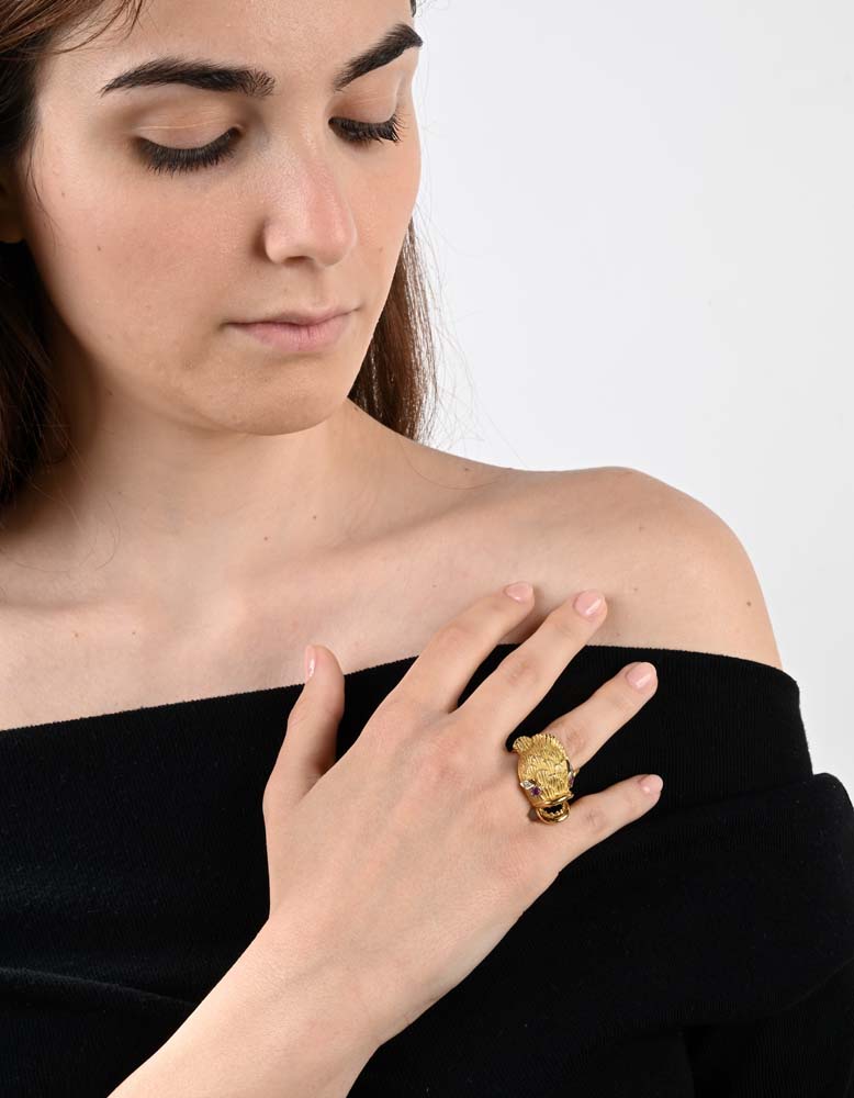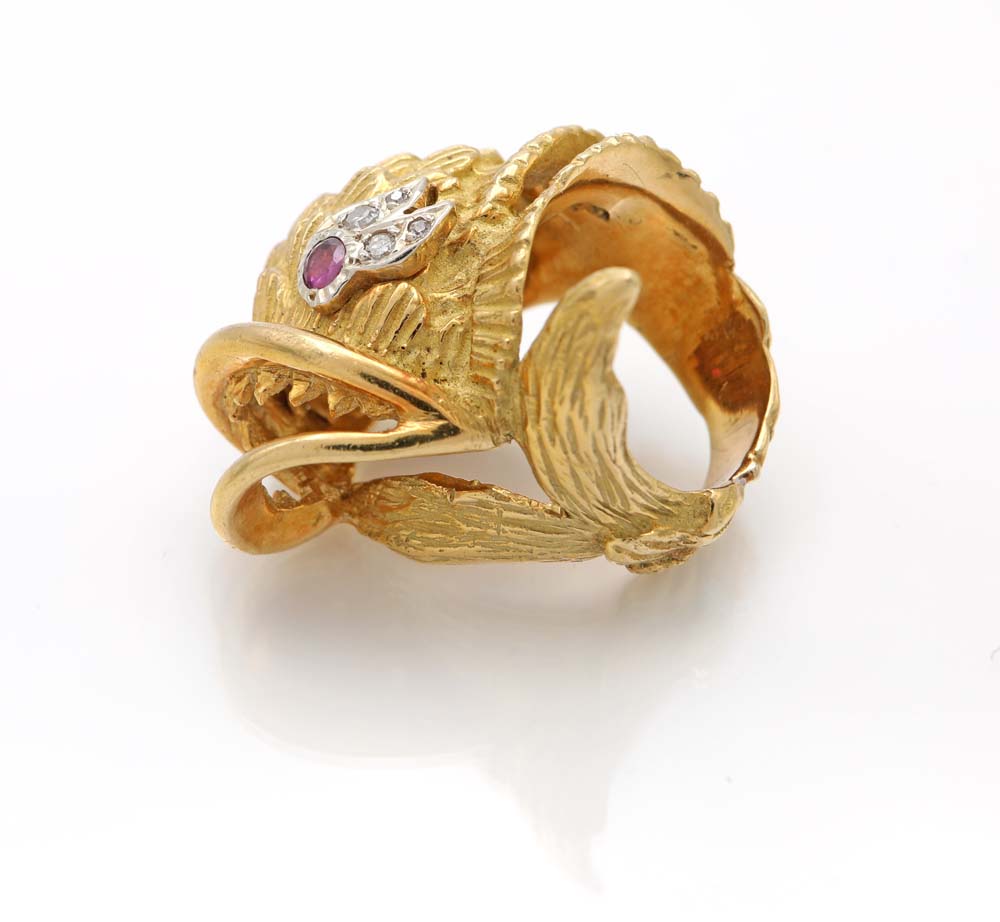 Anello animalier in oro rubini e brillanti Misura 8 Oro giallo 750/000. Peso complessivo gr. 16,50.