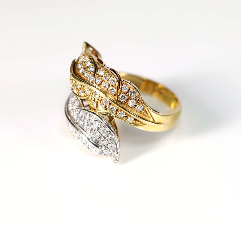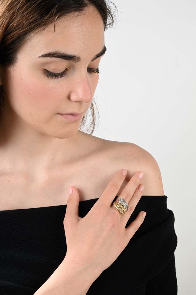 Anello contrariè in oro e brillanti Misura 16 Oro giallo e bianco 750/000. diamanti in taglio rotondo brillante. Peso complessivo gr. 10,20