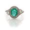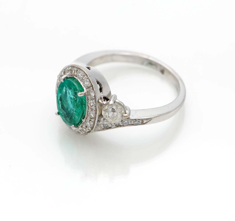 Anello in oro, brillanti e smeraldo Misura 15 Oro bianco 750/000. Smeraldo naturale in taglio ovale ct. 2,50 ca., diamanti in taglio rotondo brillante ct. 1,10 ca. Peso complessivo gr. 6,70.