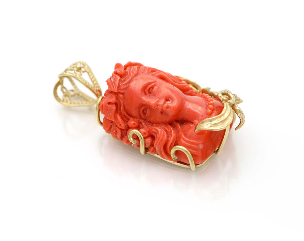 Pendente in oro e corallo cm 4,5 Oro giallo 750/000. Peso complessivo gr. 11,50.