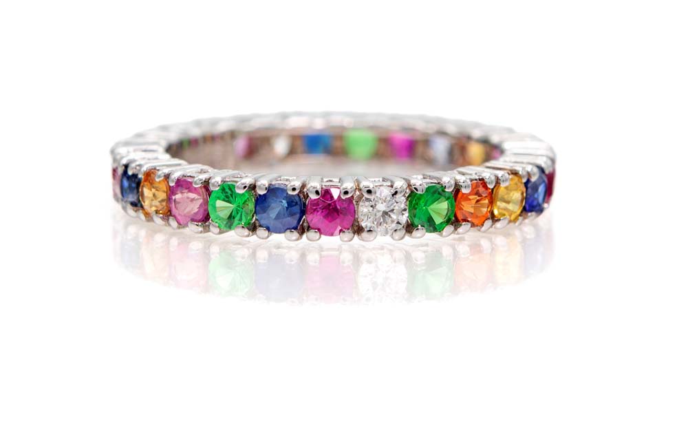 Riviera eternelle in oro e brillanti e zaffiri Misura 13 Oro bianco 750/000. Zaffiri blu, rosa, verdi, gialli e diamanti ct. 1 ca. Peso complessivo gr. 2,90