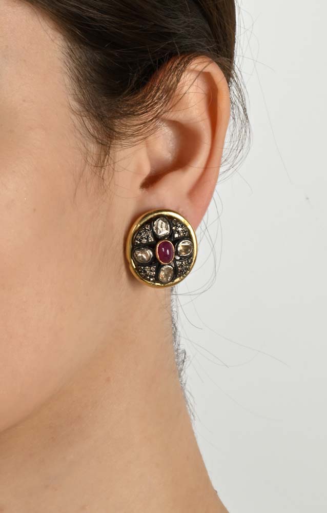 Coppia di orecchini in oro e argento, rubini e diamanti cm 2,5 x 2 Oro giallo...