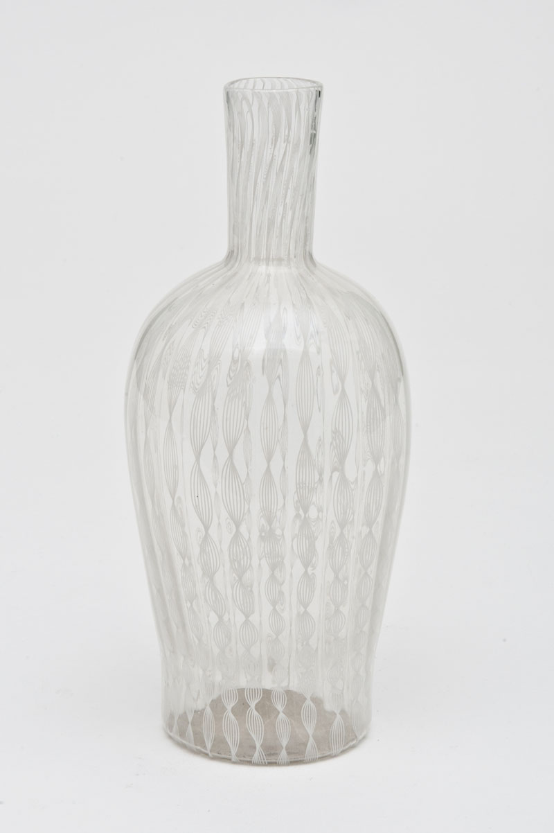 Manifattura di Murano - Piccola bottiglia in vetro cristallo a canne di zanfirico bianco. II metà del sec XX. (h cm 25)