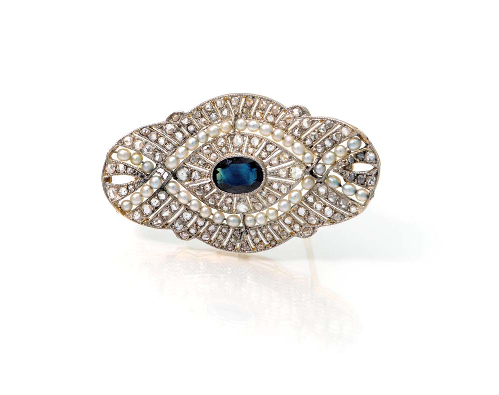 Spilla antica in oro, platino, perle naturali , diamanti e zaffiro centrale...
