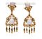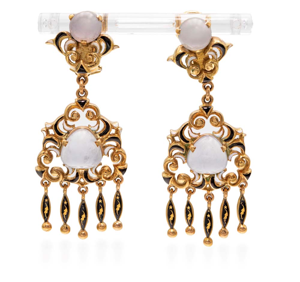 Petochi coppia di orecchini pendenti in smalto e pietra di luna Lunghezza cm 6 Oro giallo 750/000. Peso complessivo gr. 21,80.