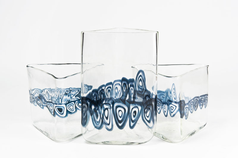 Manifattura di Murano. Lotto di tre vasi a base triangolare in vetro soffiato a murrine blu e trasparenti (misure diverse)