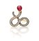 Spilla antica in oro, argento, diamanti e rubino cabochon cm 3 x 3 Oro giallo 750/000, argento. Peso complessivo gr. 6,30.