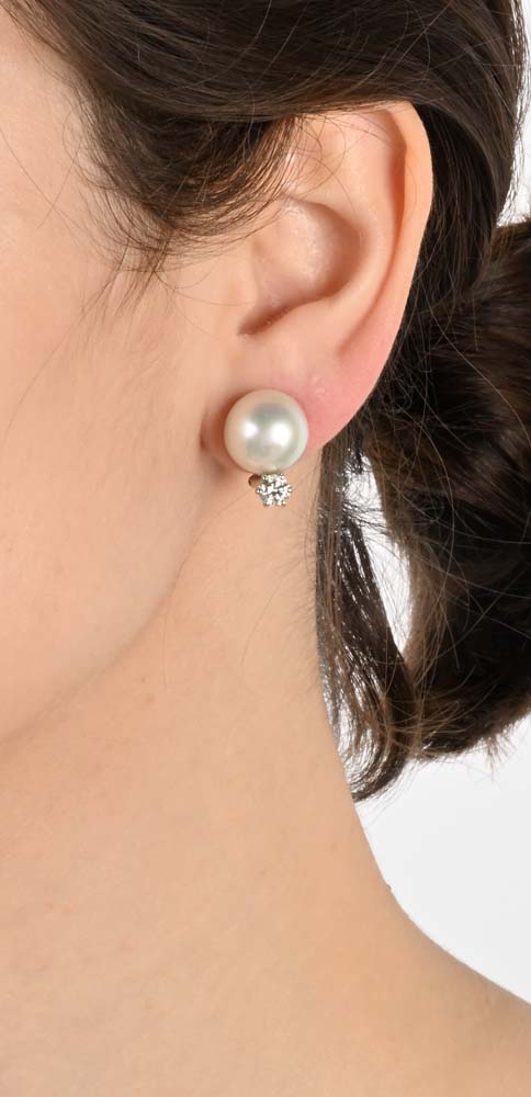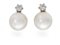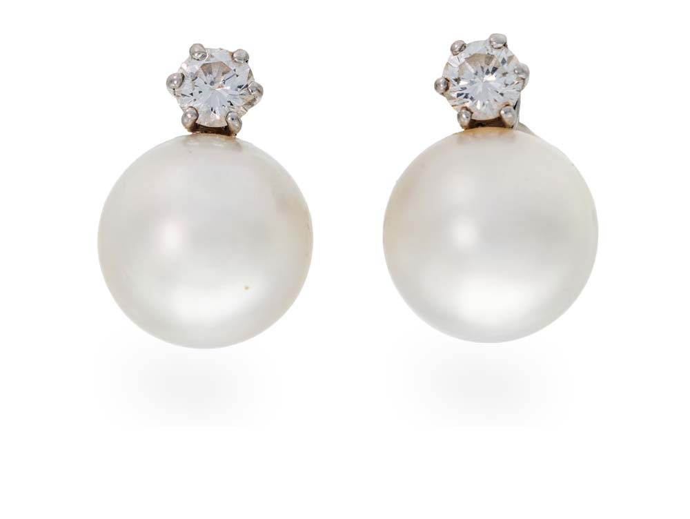 Coppia di orecchini in oro, perle e brillanti cm 2 Oro bianco 750/000. Perle South Sea mm. 13, diamanti in taglio rotondo brillante ct. 0,70 ca. Peso complessivo gr. 12.
