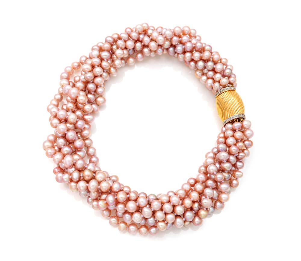Torchon in oro, diamanti e perle di acqua dolce Lunghezza cm 44 Oro giallo 750/000.