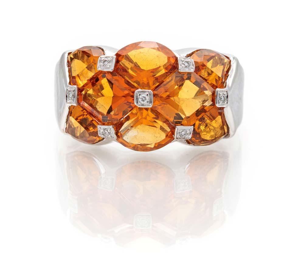 Anello in oro, brillanti e topazi Misura 15 Oro bianco 750/000. Peso gr. 8,40.