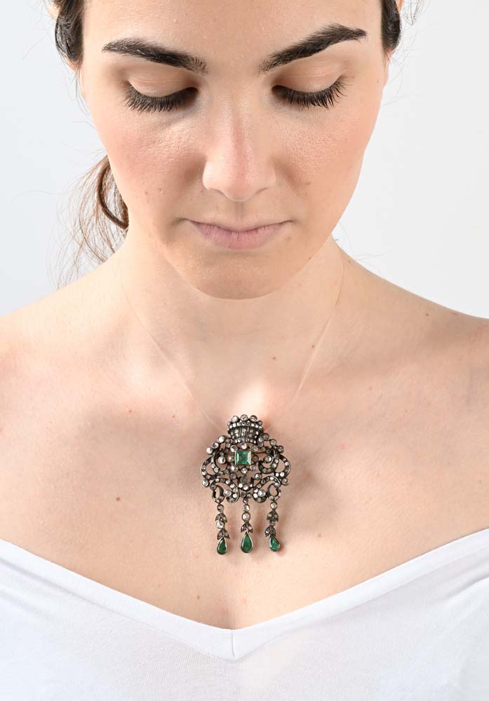 Spilla pendente antica in oro, argento, diamanti e smeraldi cm 7 x 4,5 Primi XIX secolo Oro giallo 750/000, argento. Peso complessivo gr. 21,10
