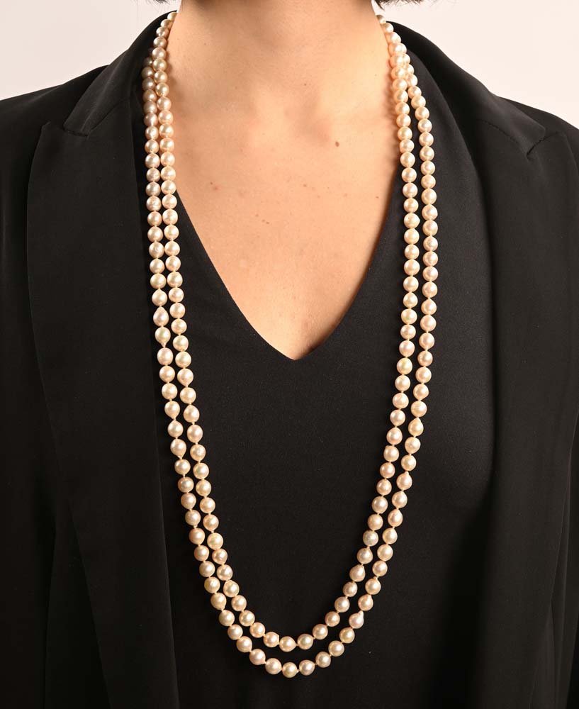Lunga collana di perle a due fili con chiusura in oro, topazio e rubini...