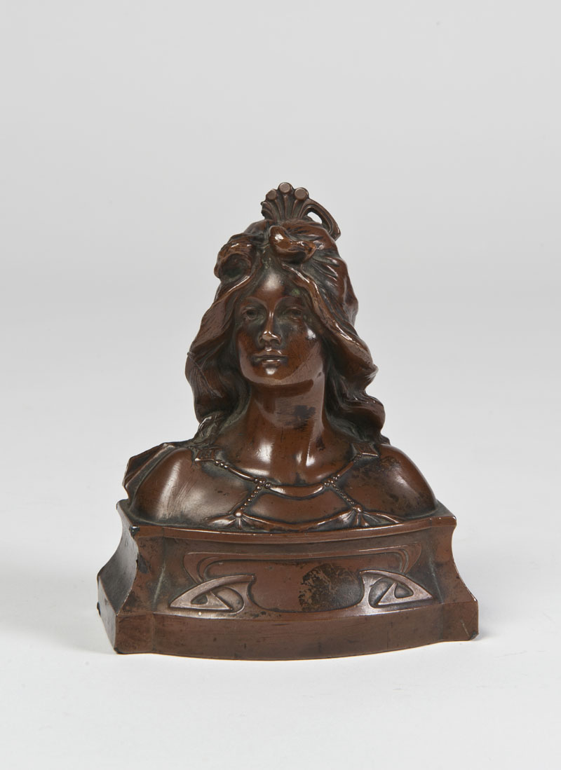 Piccolo busto Art Nouveau in bronzo patinato raffigurante una fanciulla....