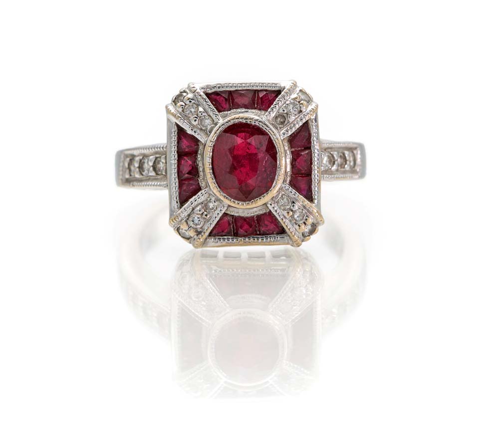 Anello in oro, rubini e brillanti Misura 12 Oro bianco 750/000. Peso complessivo gr. 6,20
