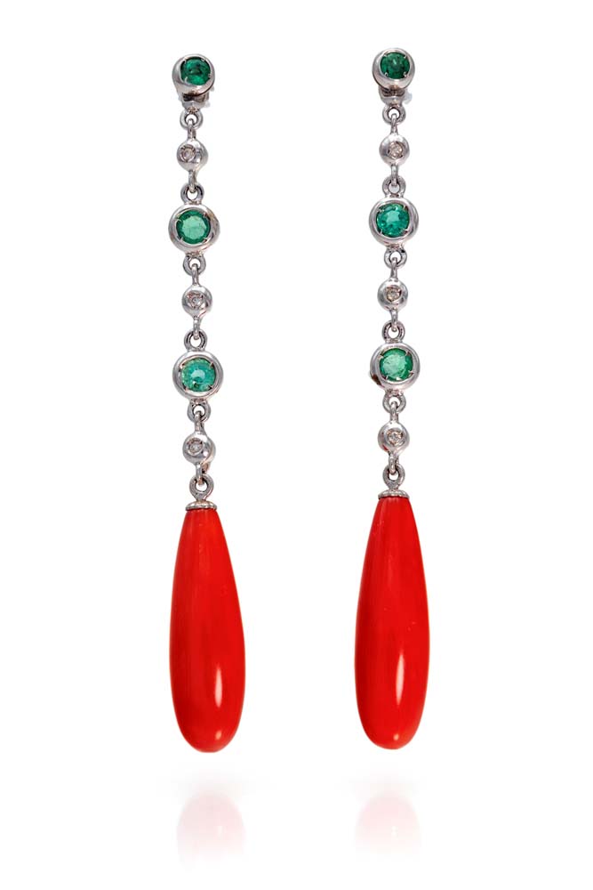 Coppia di orecchini pendenti in oro, corallo, smeraldi e brillanti Lunghezza cm 8 Oro bianco 750/000. Peso complessivo gr. 12.