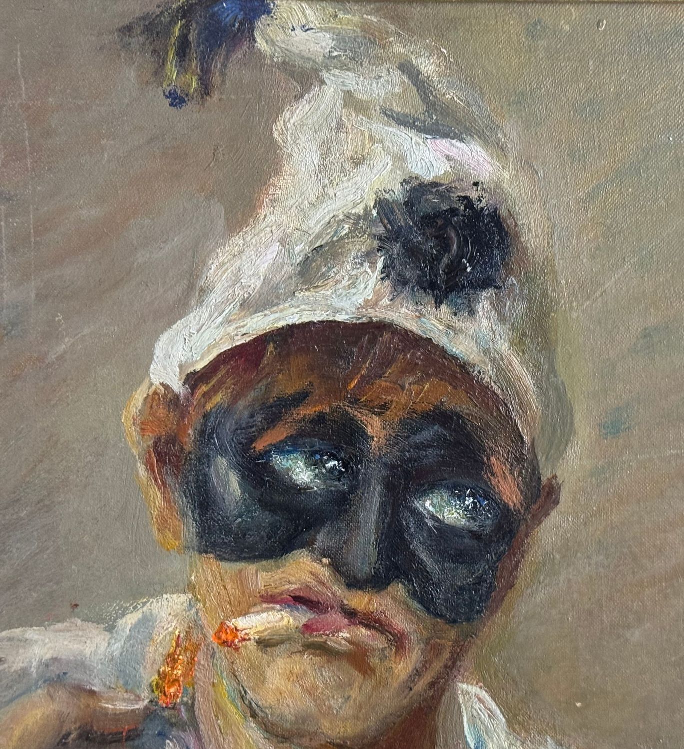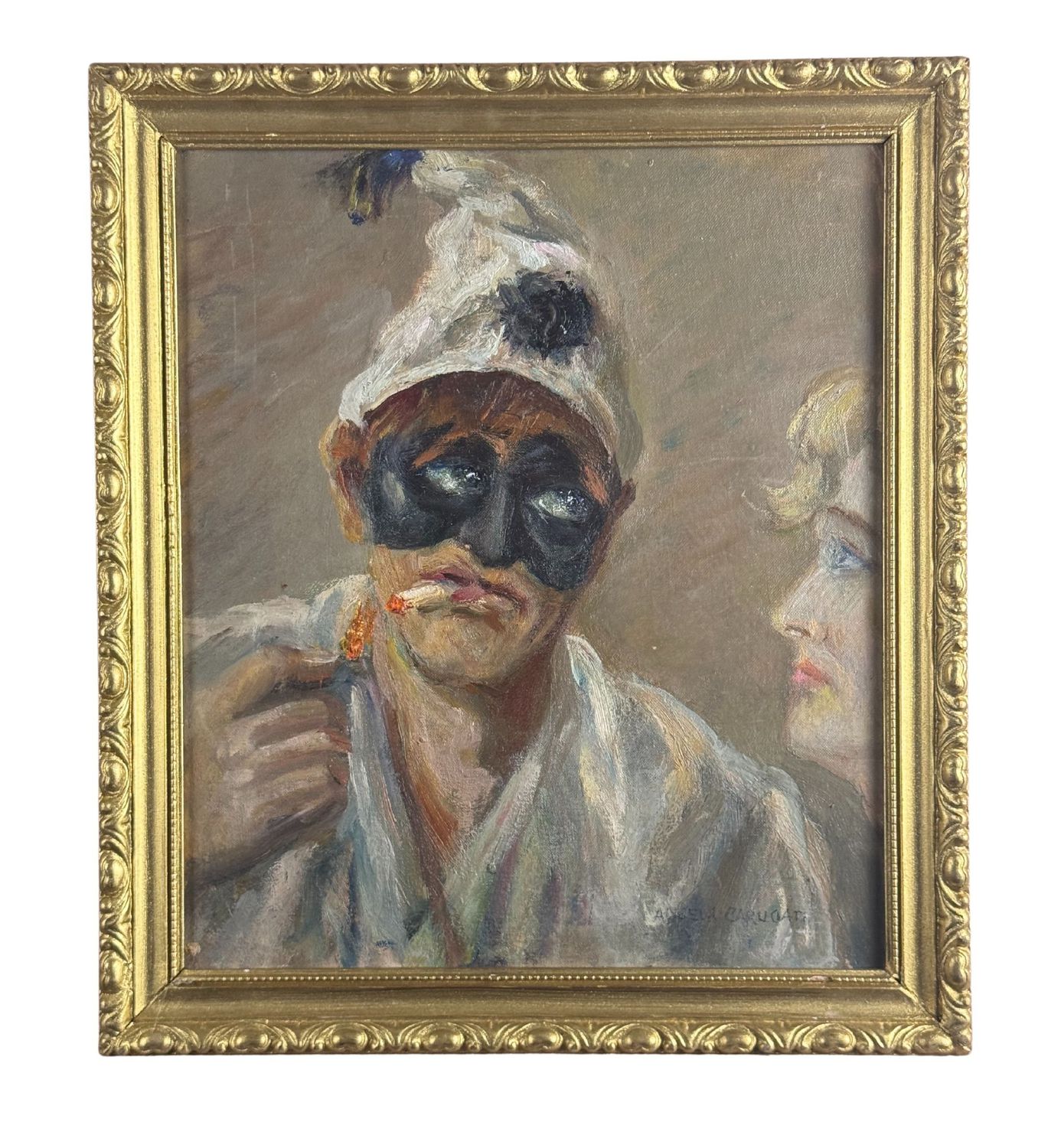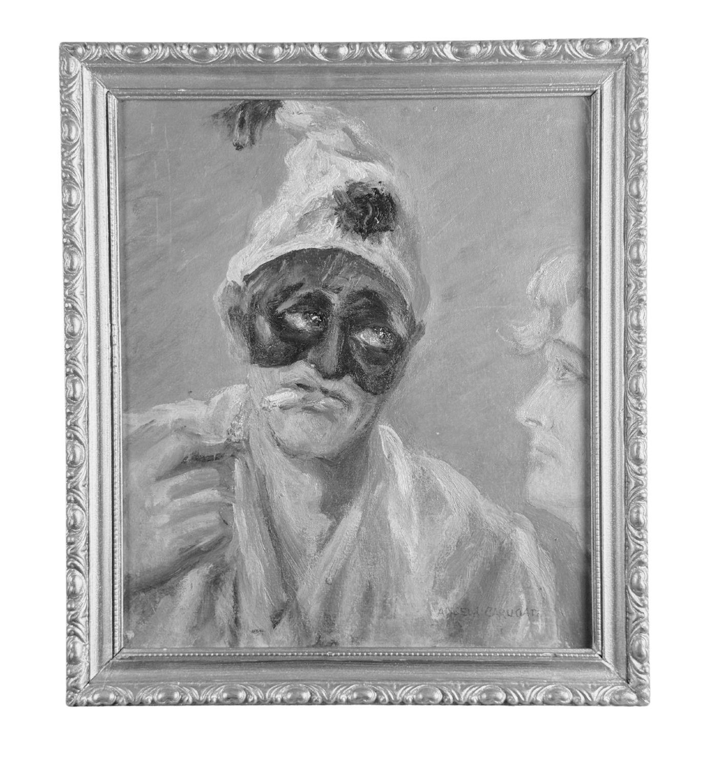 Dipinto olio su cartoncino, periodo XX secolo scuola Italiana, raffigurante Pulcinella. Dimensioni compreso cornice: 36x40 cm. Dimensioni interno cornice: 30x35 cm. Reca firma in basso a destra da Angela Carugati. Opera in buone condizioni.