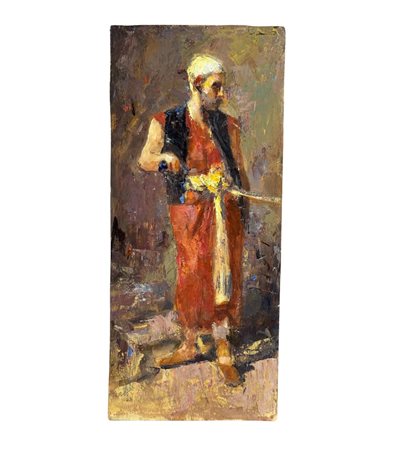 Dipinto olio su tavola, periodo XX secolo, scuola Italiana, raffigurante Ritratto di uomo arabo. Dimensioni: 16,5x38 cm. Artista anonimo. Opera in buone condizioni e di ottima qualità artistica.