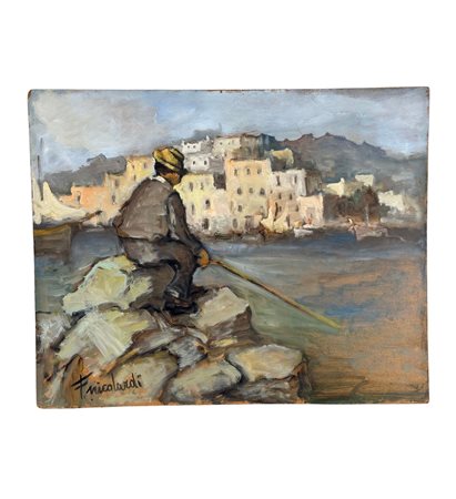 Dipinto olio su pannello, periodo XX secolo scuola Italiana, raffigurante Pescatore su marina napoletana. Dimensioni: 40x50 cm. Reca firma in basso a sinistra F. Nicolardi. Opera in buone condizioni.