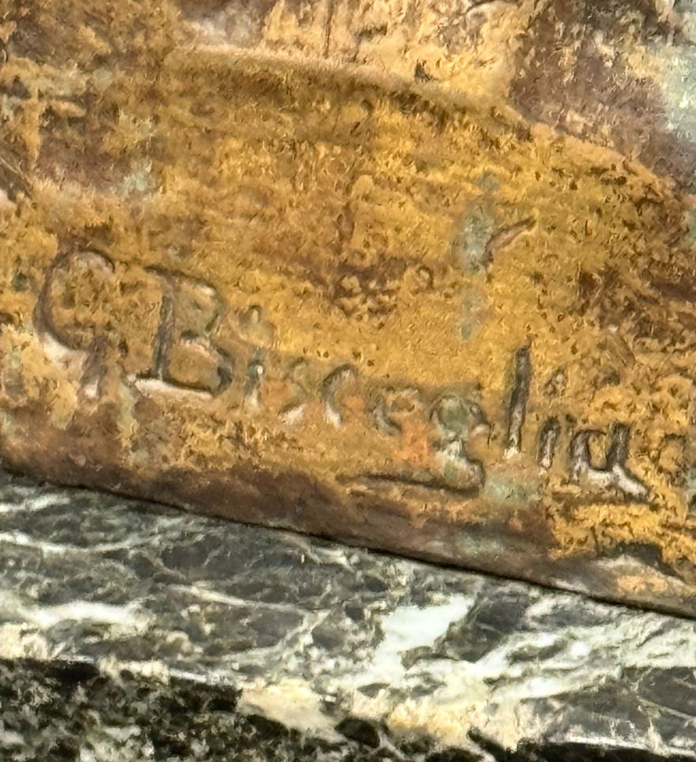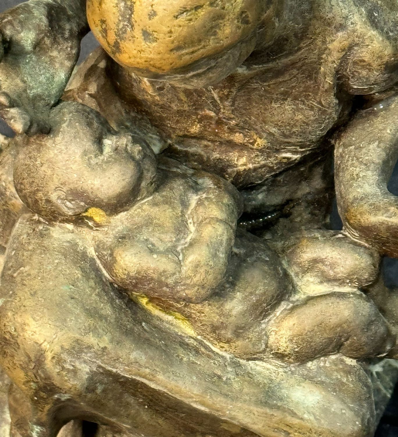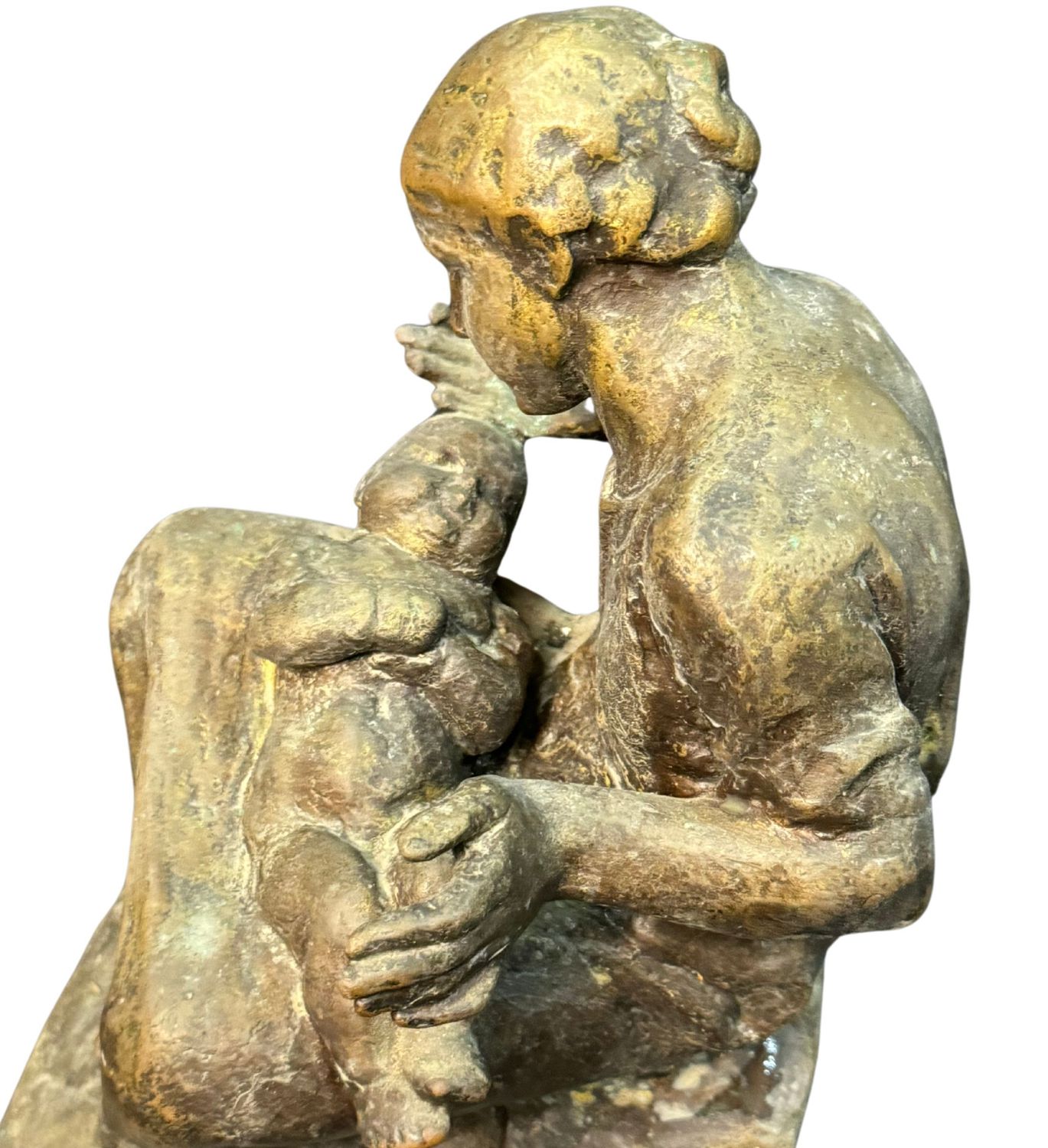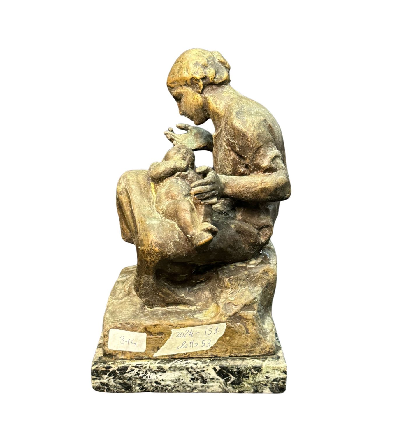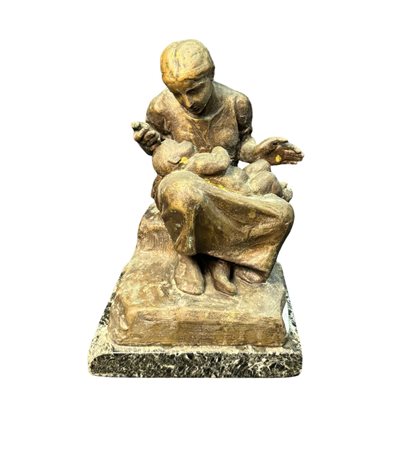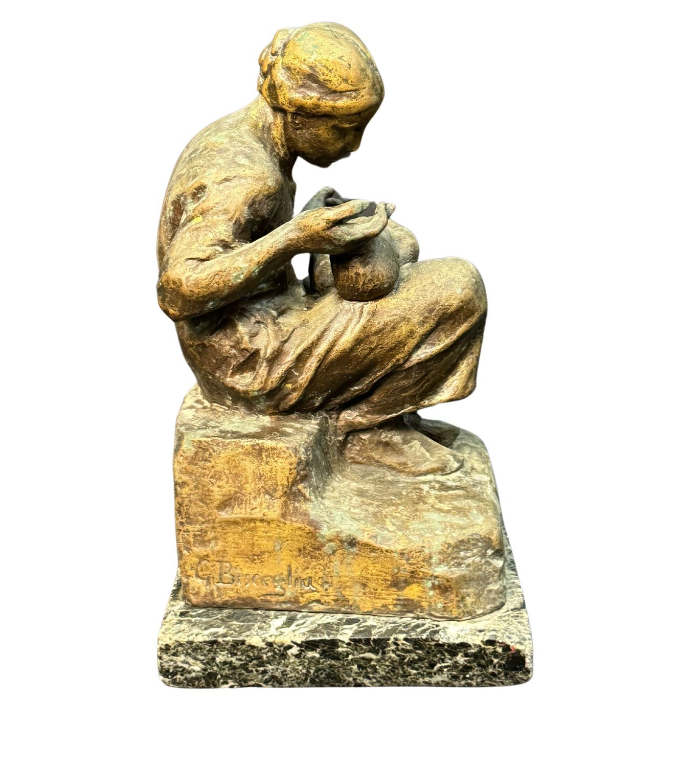 Scultura in bronzo, patinato a cera persa su base in marmo, periodo XX secolo, raffigurante Scena materna. Reca firma G. Bisceglia. Dimensioni: 33x21x19 cm. Opera in buone condizioni.