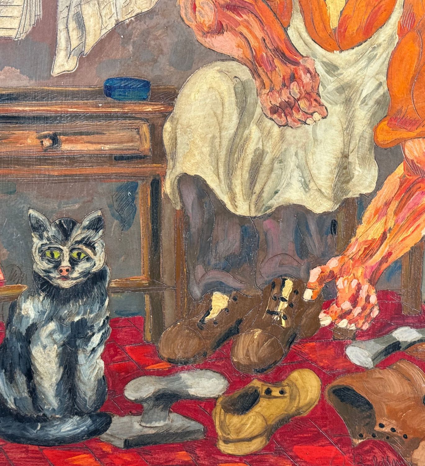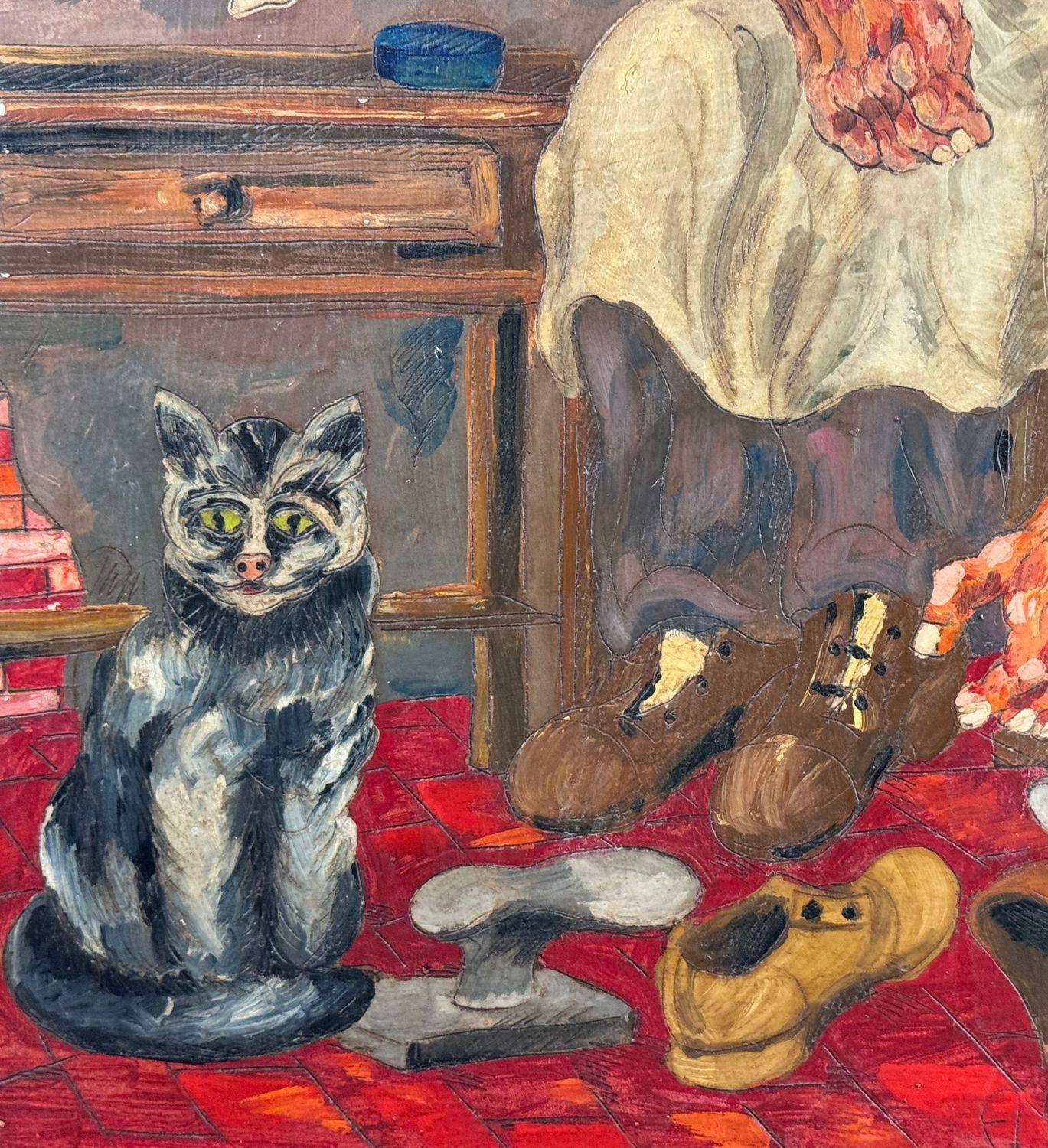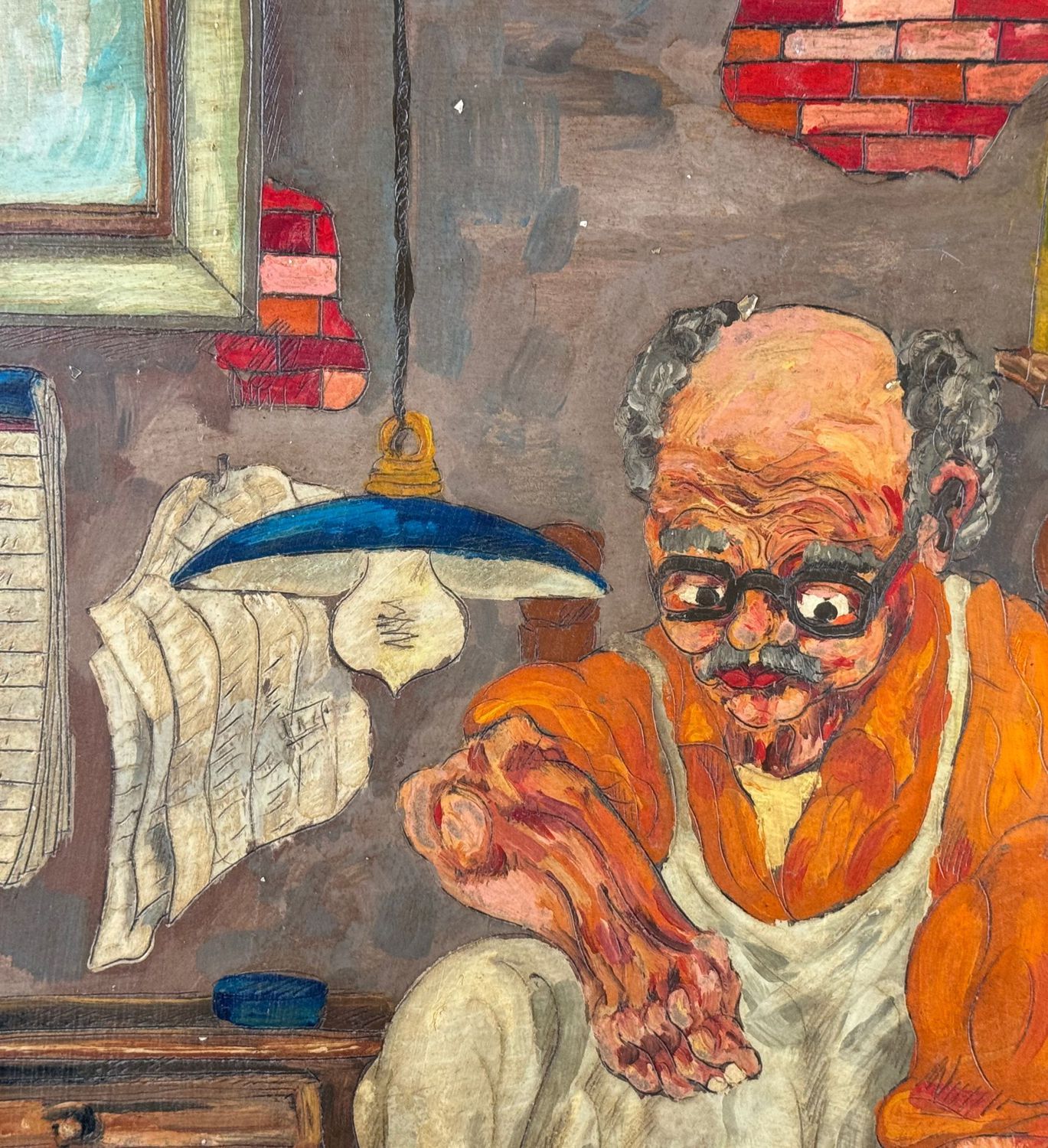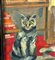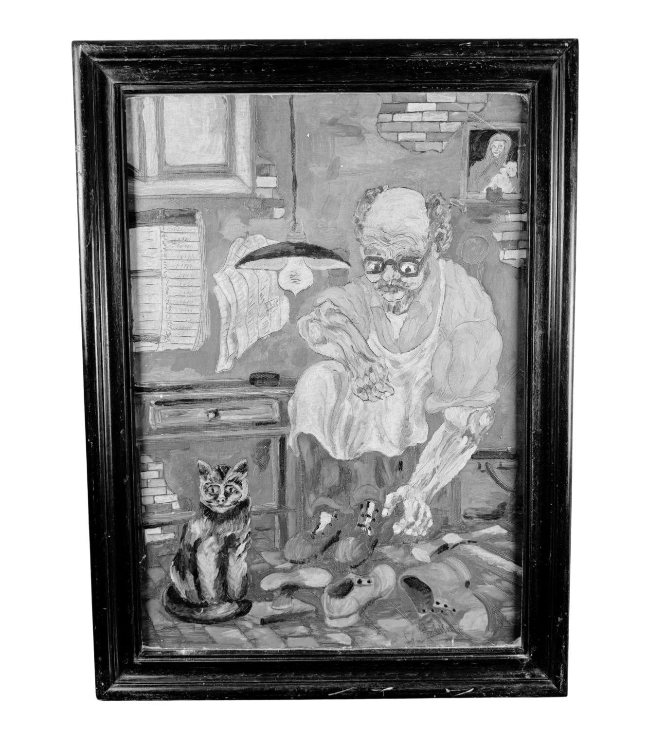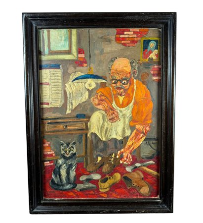 Dipinto tecnica mista su pannello, periodo XX secolo scuola italiana, raffigurante Anziano con gatto. Dimensioni compreso cornice: 59x81 cm. Dimensioni interno cornice: 51x72 cm. Reca firma in basso a destra da artista non identificato. Opera in buone condizioni.