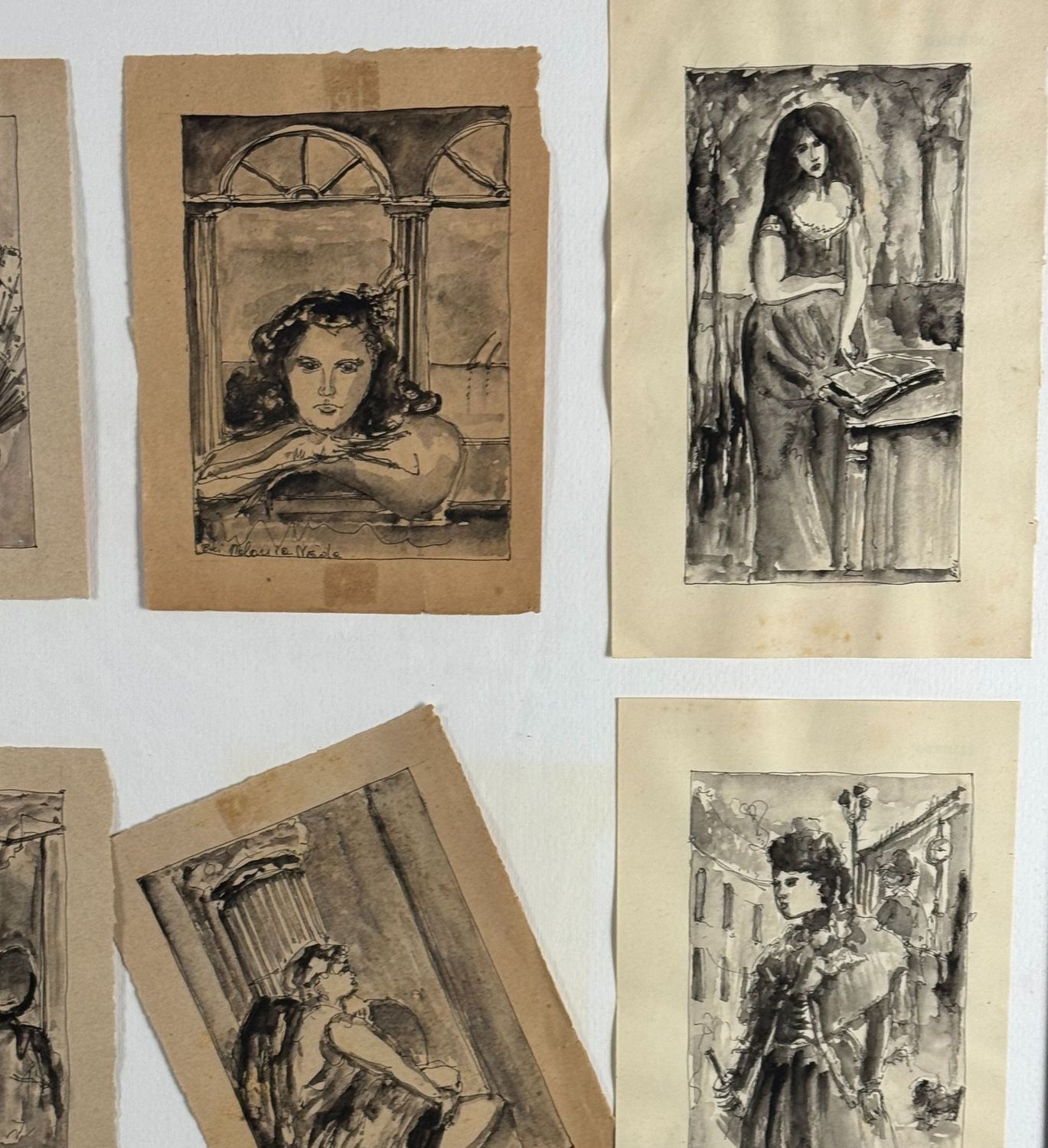 Assemblamento di 8 disegni su carta, periodo XX secolo scuola Italiana, raffiguranti Vari personaggi femminili. Dimensioni compreso cornice: 68x52 cm. Dimensioni interno cornice: 62x46 cm. Da artista anonimo. Opera in buone condizioni.