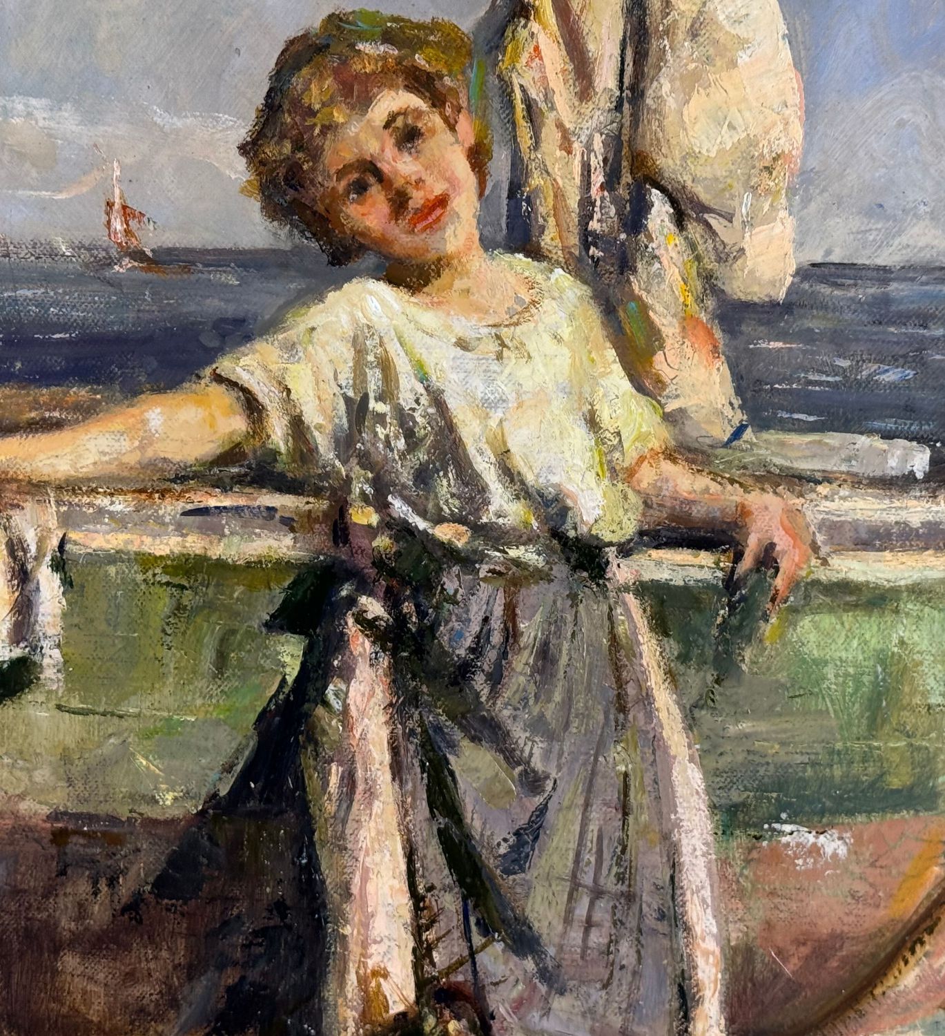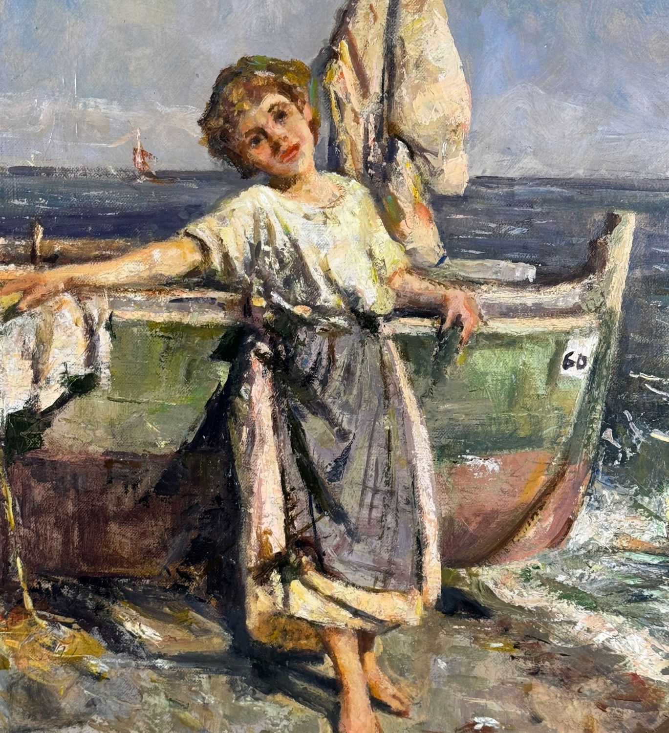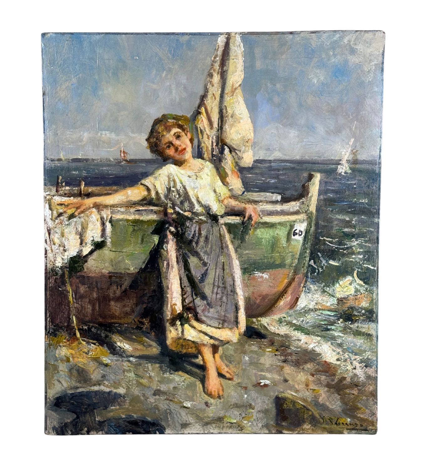 Dipinto olio su tela, periodo XX secolo, scuola Italiana, raffigurante Donna su marina. Tratto da un'opera di Giuliano Bartolomeo. Dimensioni: 50x60 cm. Reca firma in basso a destra artista non identificato. Opera in ottime condizioni e di eccellente qualità artistica.