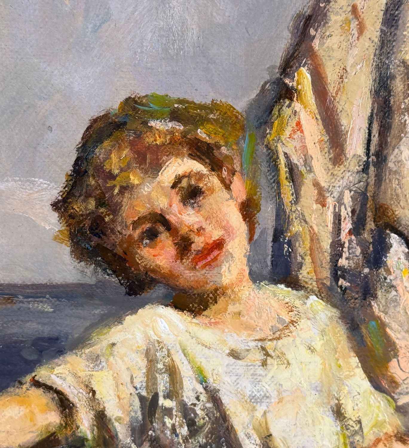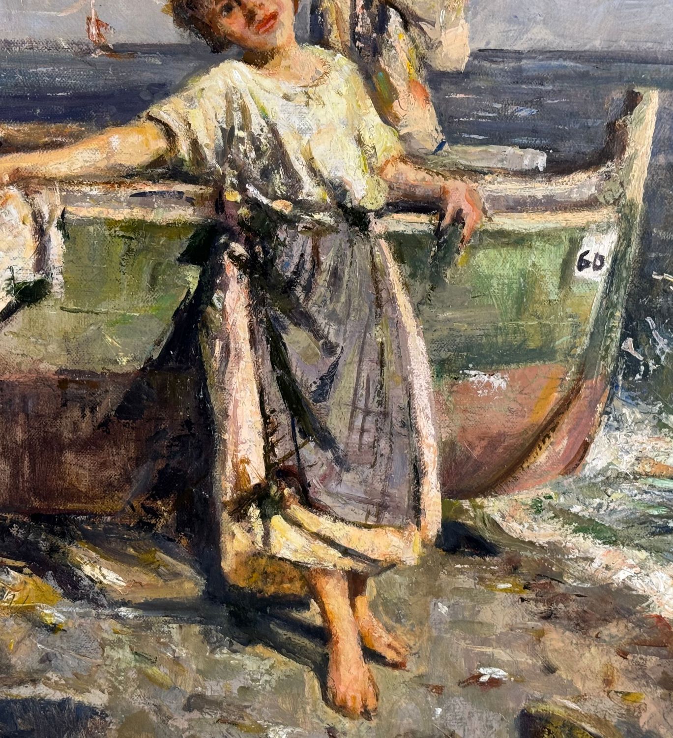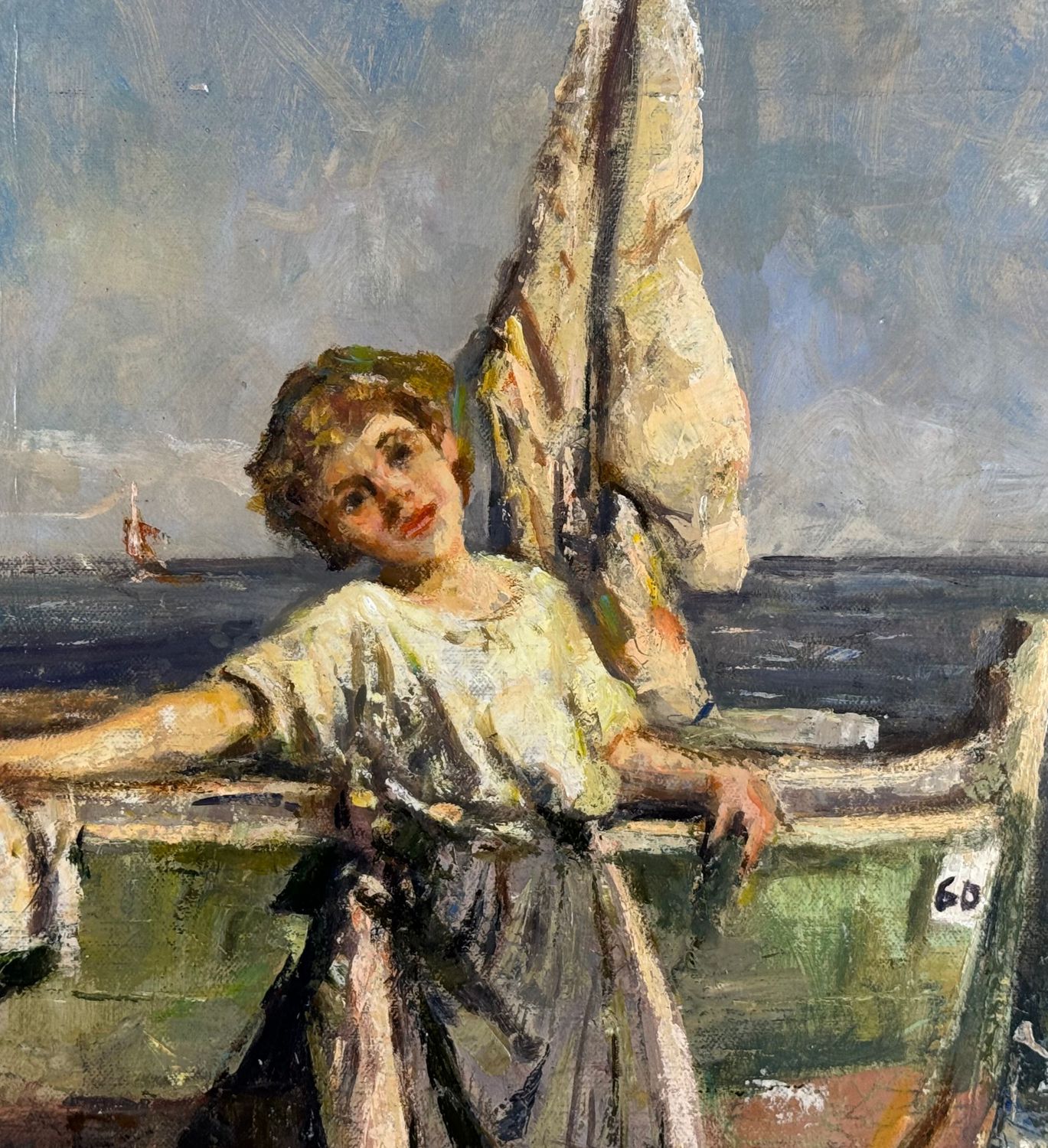 Dipinto olio su tela, periodo XX secolo, scuola Italiana, raffigurante Donna su marina. Tratto da un'opera di Giuliano Bartolomeo. Dimensioni: 50x60 cm. Reca firma in basso a destra artista non identificato. Opera in ottime condizioni e di eccellente qualità artistica.