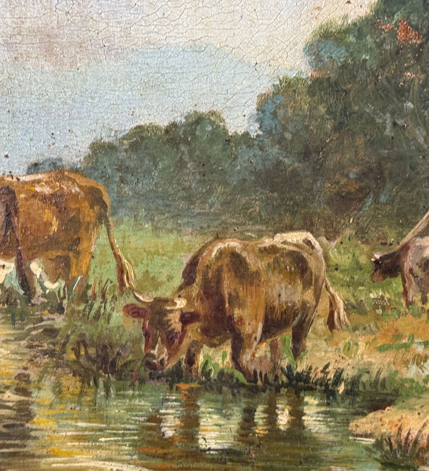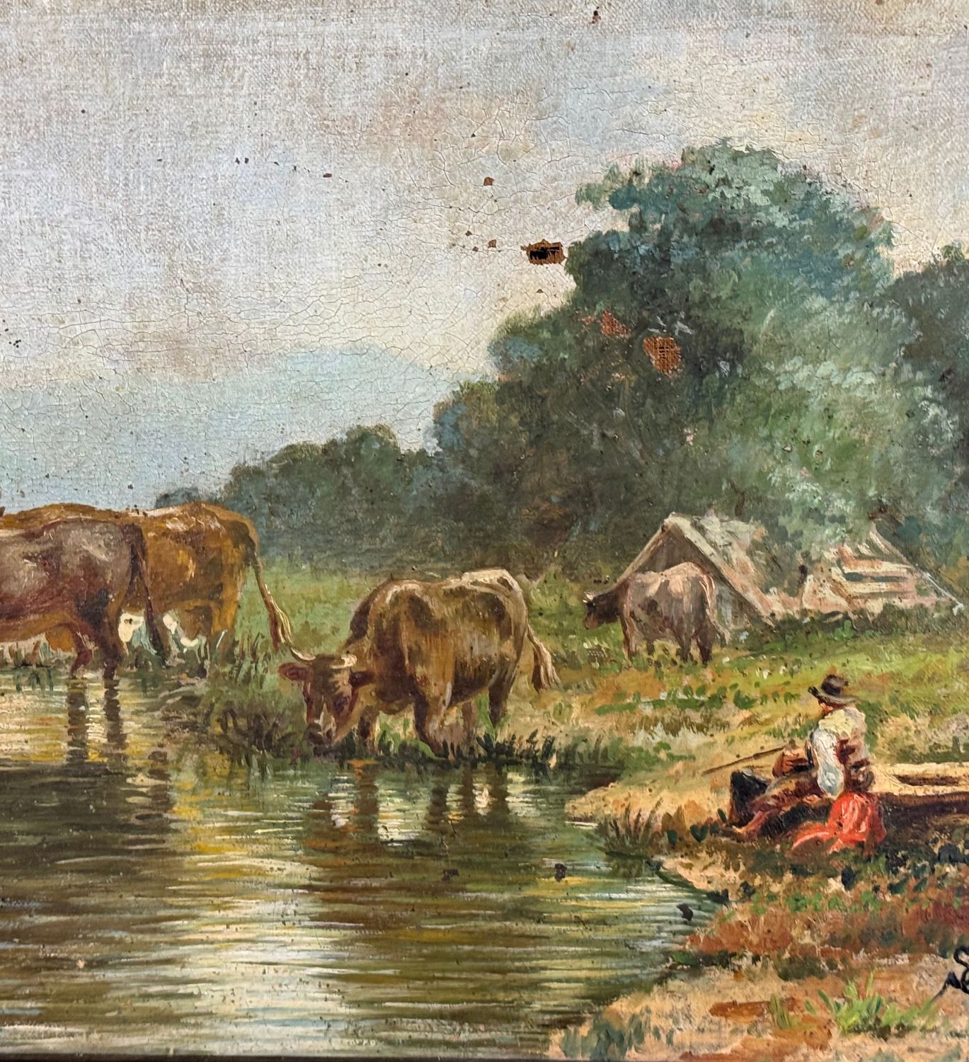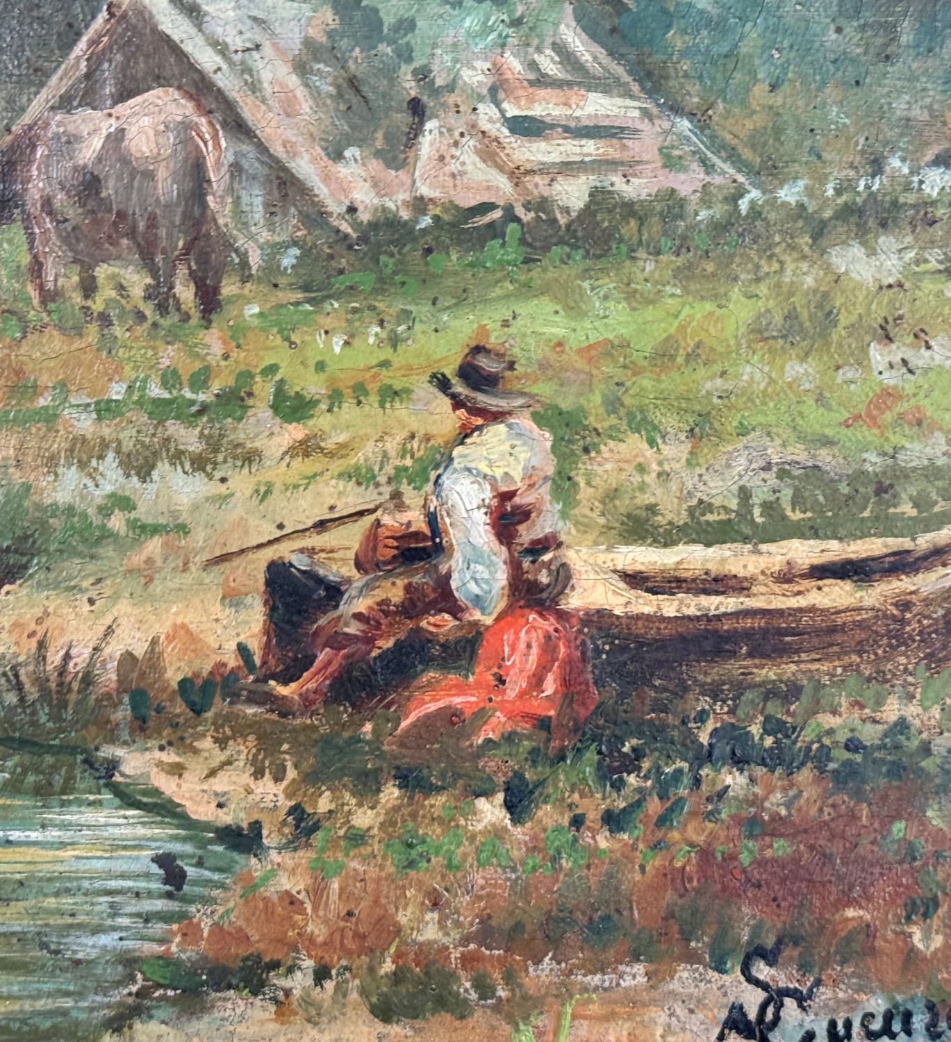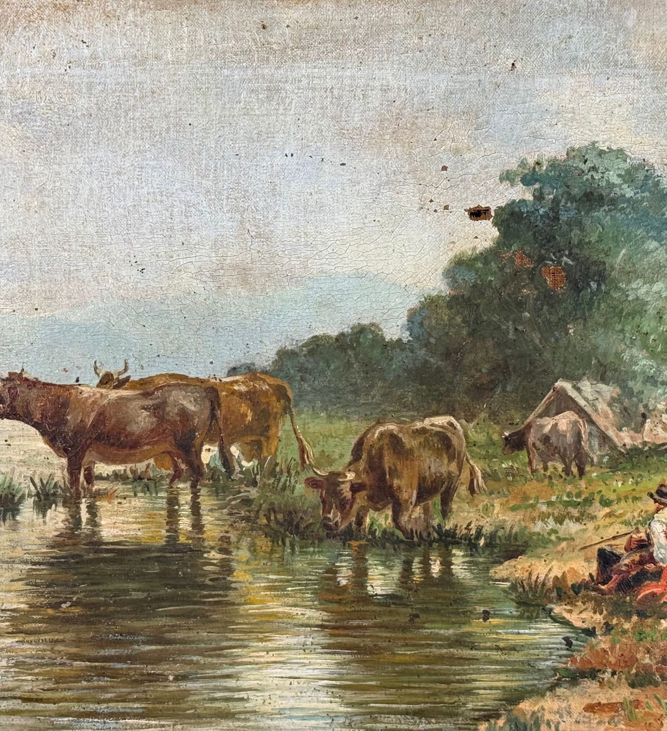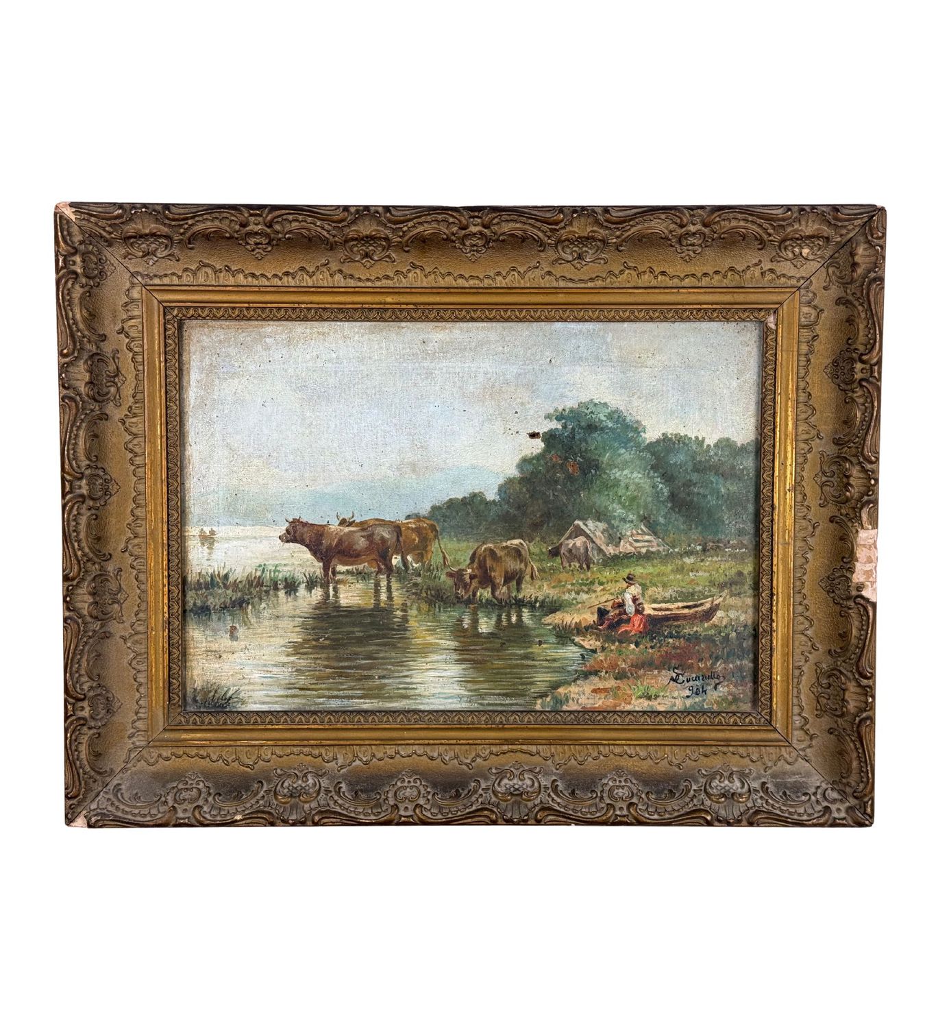Dipinto olio su tela, periodo XX secolo scuola Italiana, raffigurante Paesaggio con gregge. Dimensioni compreso cornice: 52x40 cm. Diemnsioni interno cornice: 39,5x27 cm. Reca firma in basso a destra da artista non identificato. Opera in discrete condizioni con lievi cadute di colore come da foto allegate.