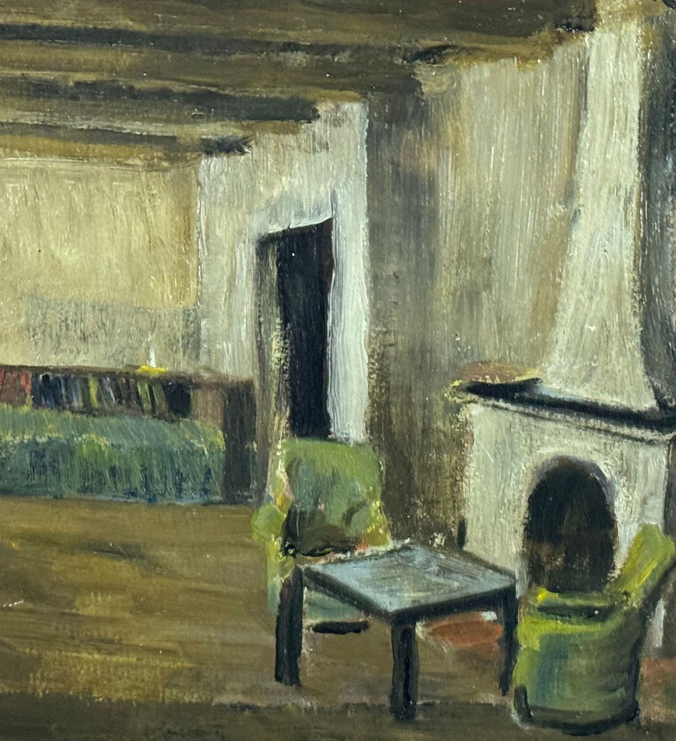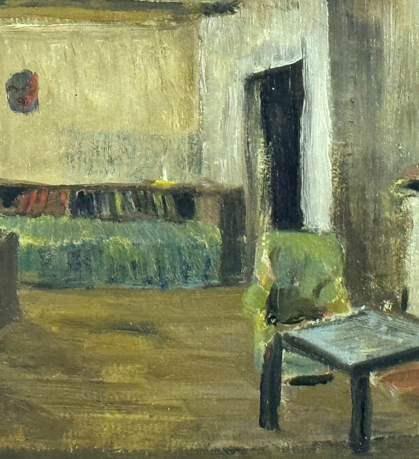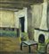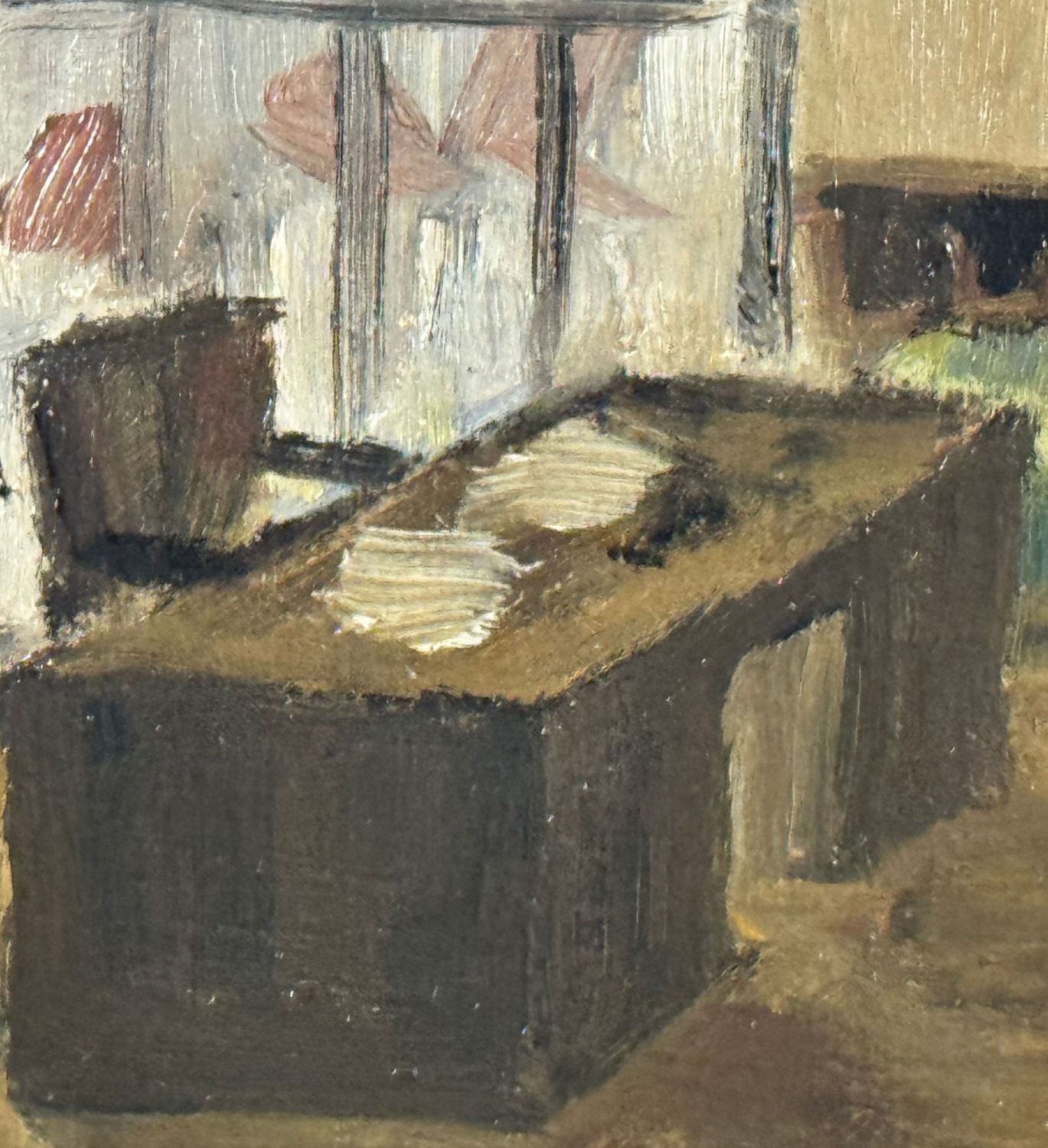 Dipinto olio su tela applicata su cartoncino, periodo XX secolo scuola Europea, raffigurante Interno. Dimensioni compreso cornice: 40,5x30,5 cm. Diemnsioni interno cornice: 34x24 cm. Reca firma in basso a destra da artista non identiifcato. Opera in buone condizioni.