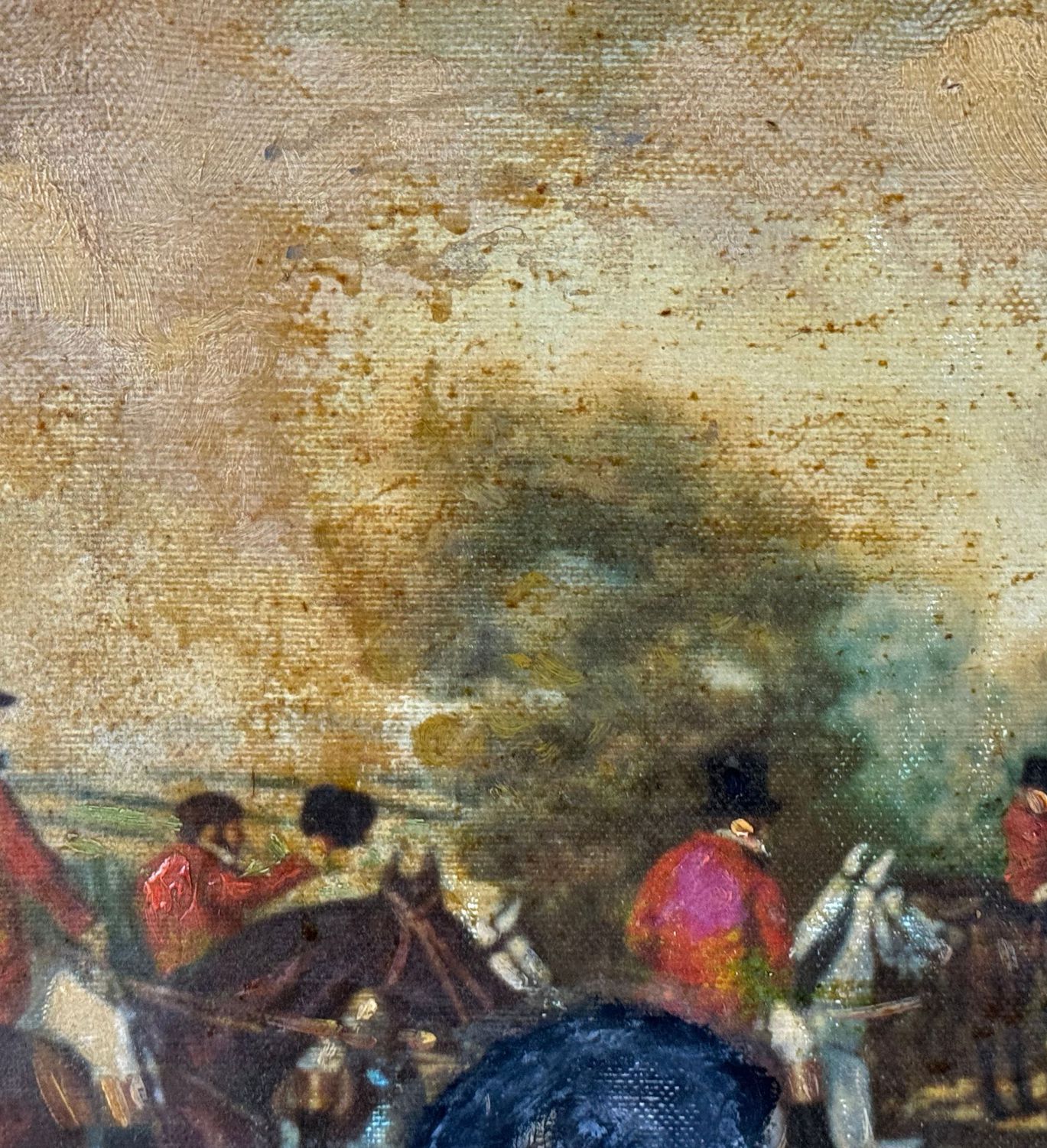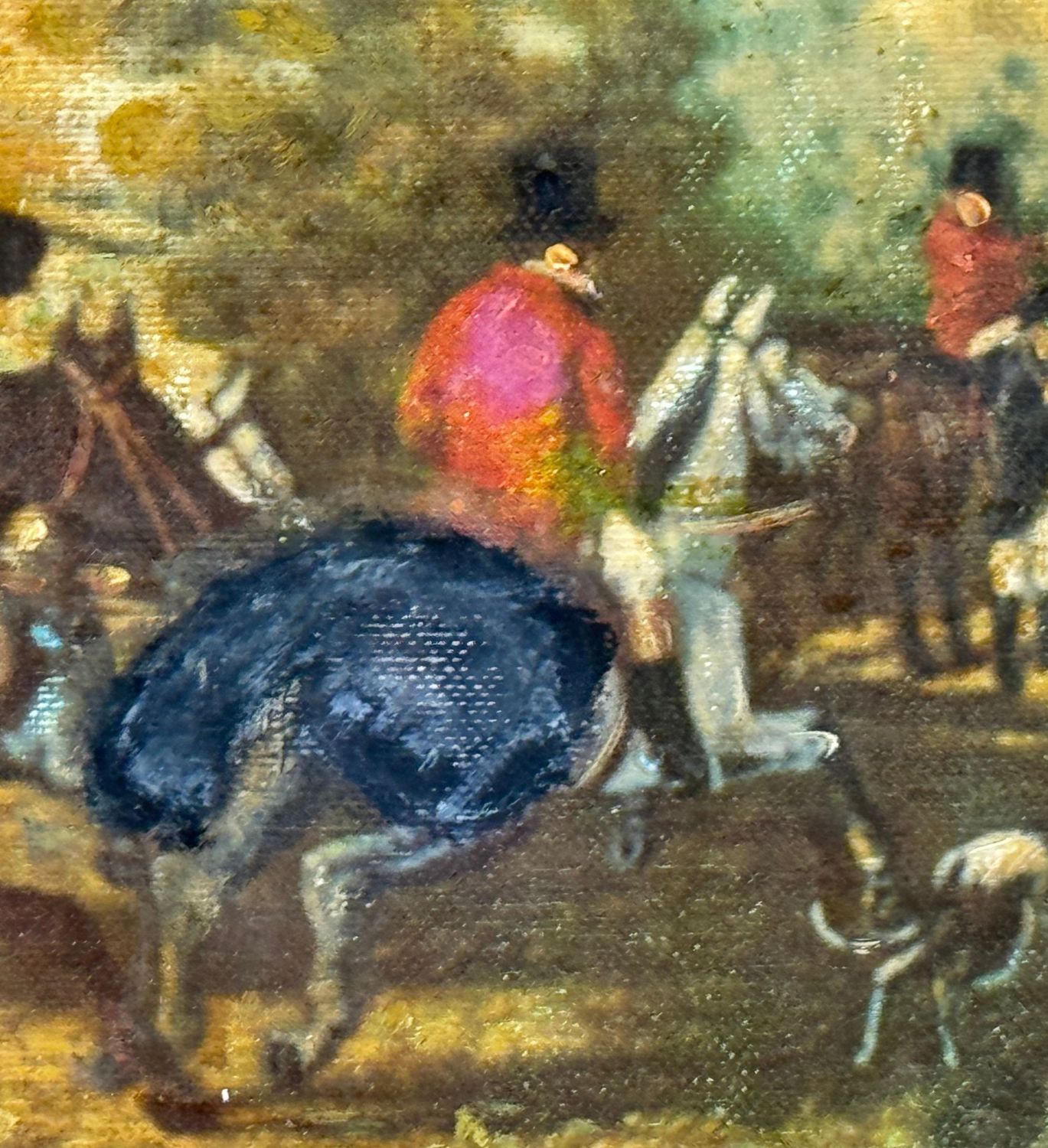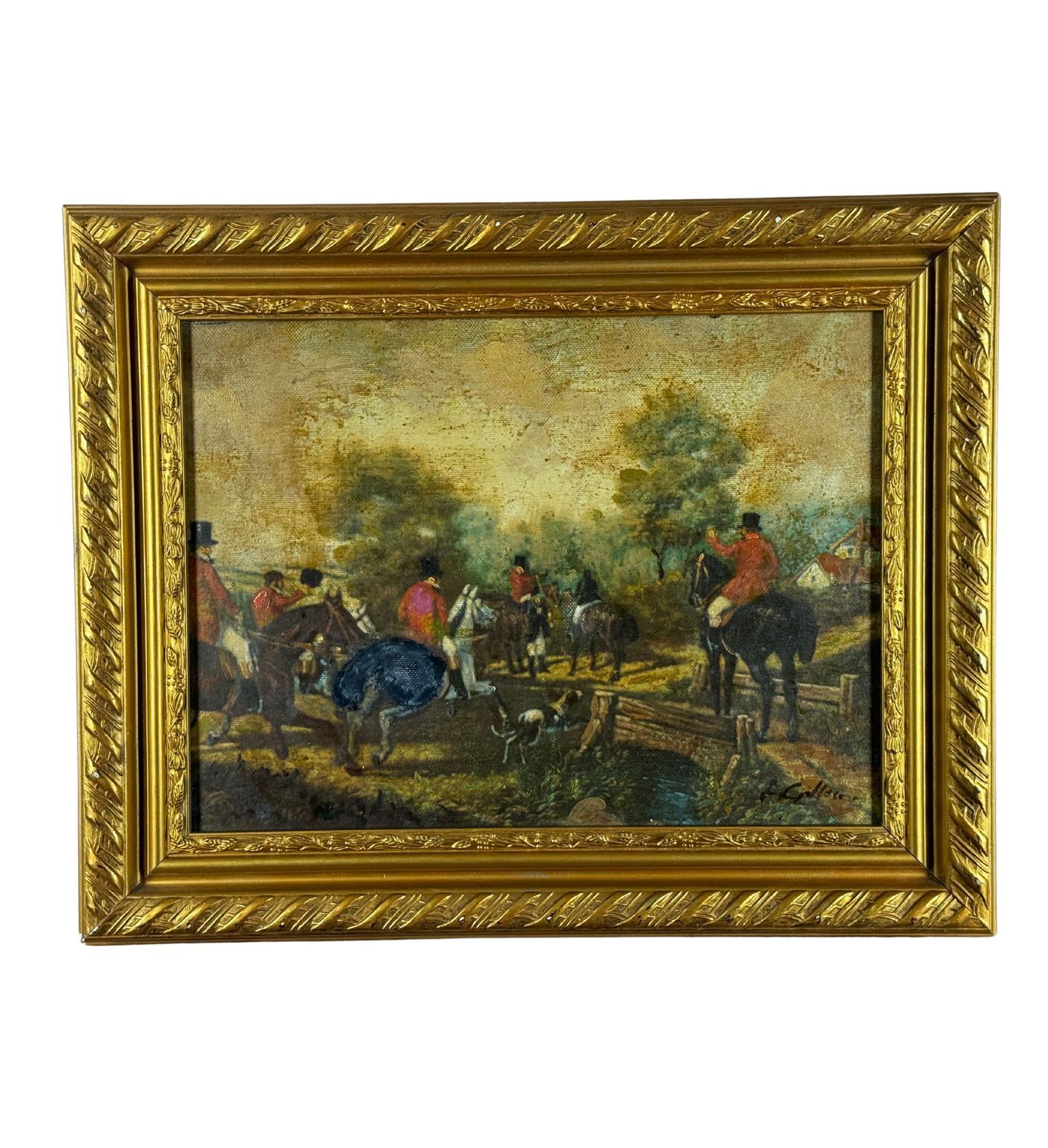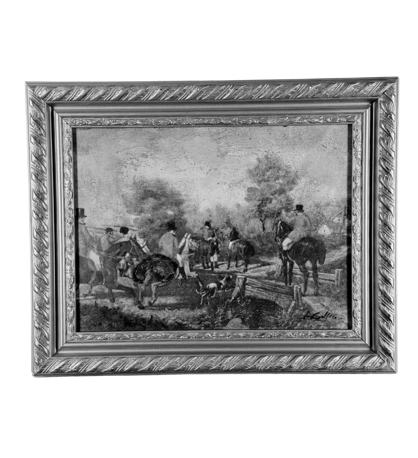 Dipinto olio su tela, periodo XX secolo scuola Italiana, raffigurante Caccia alla volpe. Dimensioni compreso cornice: 50x40 cm. Dimensioni interno cornice: 39x30 cm. Reca firma in basso a destra da artista non identificato. Opera in buone condizioni.
